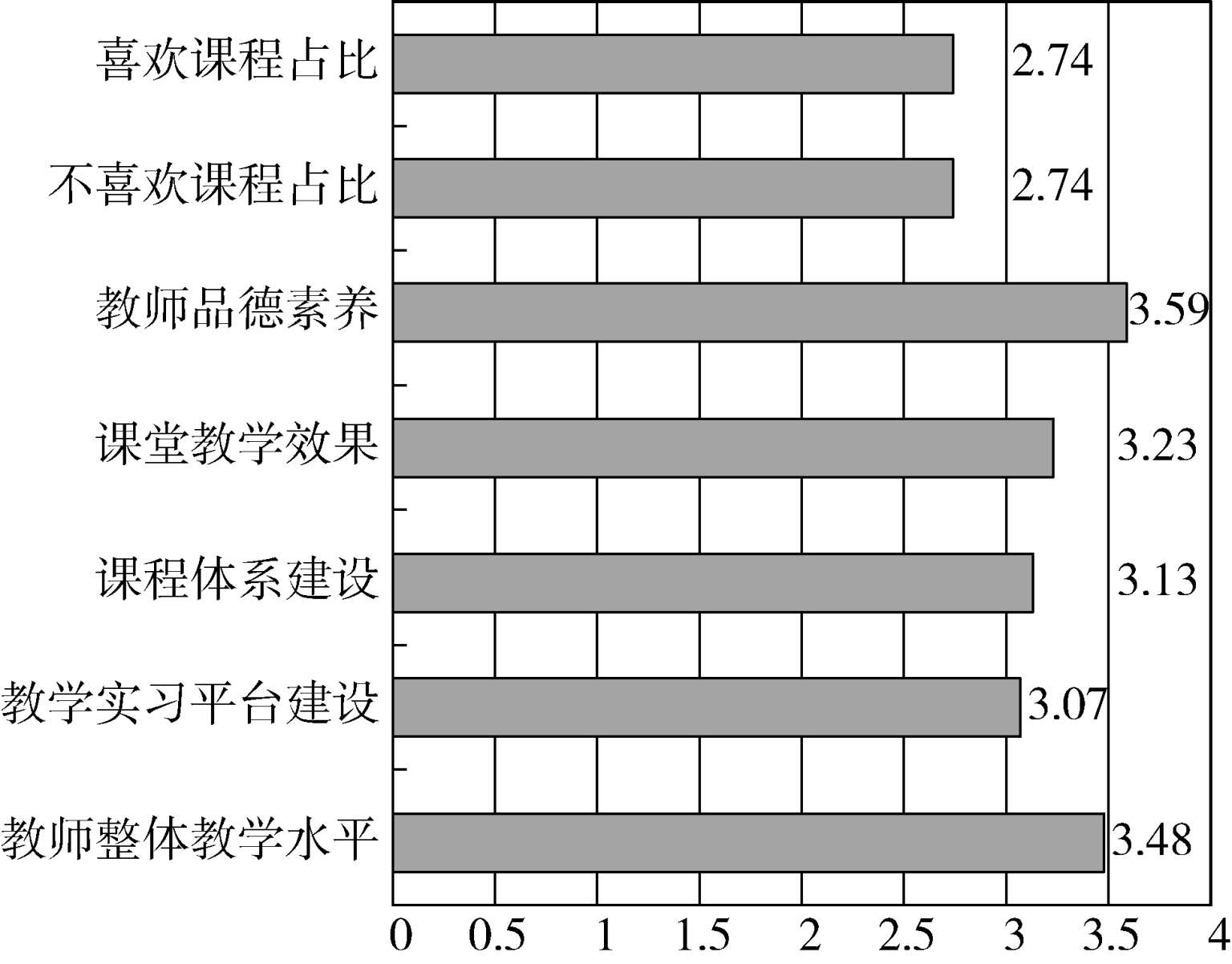 第39~45题,测量的是学生对学院的课程设置与整体教学的评价。这7道题每一题的总均值如图14所示。总体上看,学生对学院的课程设置与整体教学的评价较高,大部分学生持肯定态度。其中,得分最高的前两题是,“教师品德素养”3.59分,“教师整体教学水平”3.48分,反映出教师师德良好、教学水平较高,并得到学生的认可。值得注意的是,“教学实习平台建设”3.07分,对比前面“参加与专业相关的校内外实习实践活动”的得分2.53分,此的得分显示出学生能够客观评价学院在教学工作方面做出的努力。“课程体系建设”3.13分,“课堂教学效果”3.23分,“不喜欢课程占比”2.74分,“喜欢课程占比”2.74分。