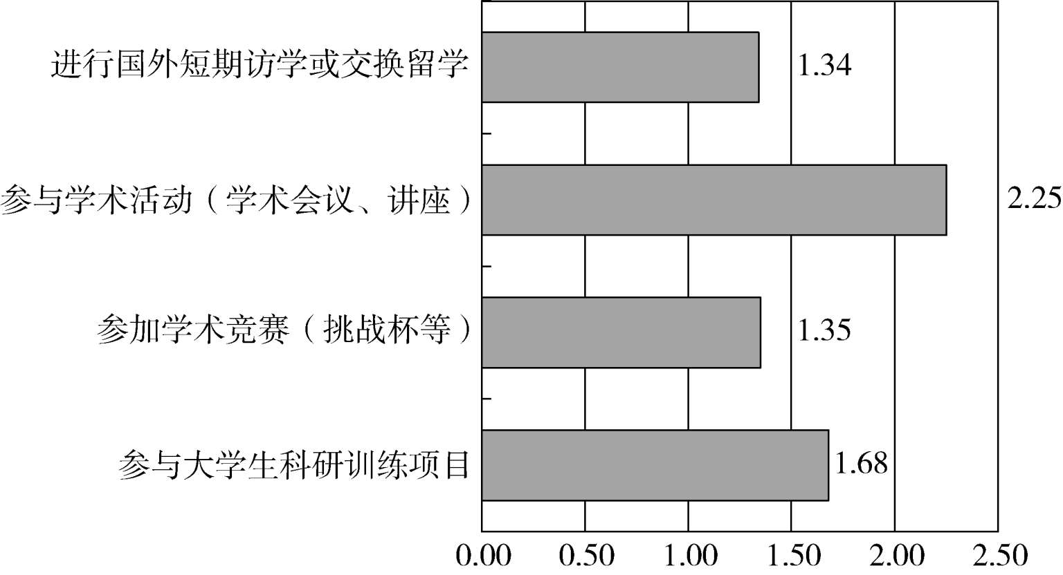 第17~20题,测量的是学生的学术与交流情况。这4道题每一题的总均值如图8所示。可以看出,这一组题目得分都比较低,远低于理论均值。“进行国外短期访学或交换留学”1.34分,“参加学术竞赛(挑战杯等)”1.35分,“参与大学生科研训练项目”1.68分。仅“参与学术活动(学术会议、讲座)”2.25分,略高一些,但也在理论均值之下。反映出在学术与交流方面,我们的本科生是十分欠缺的。