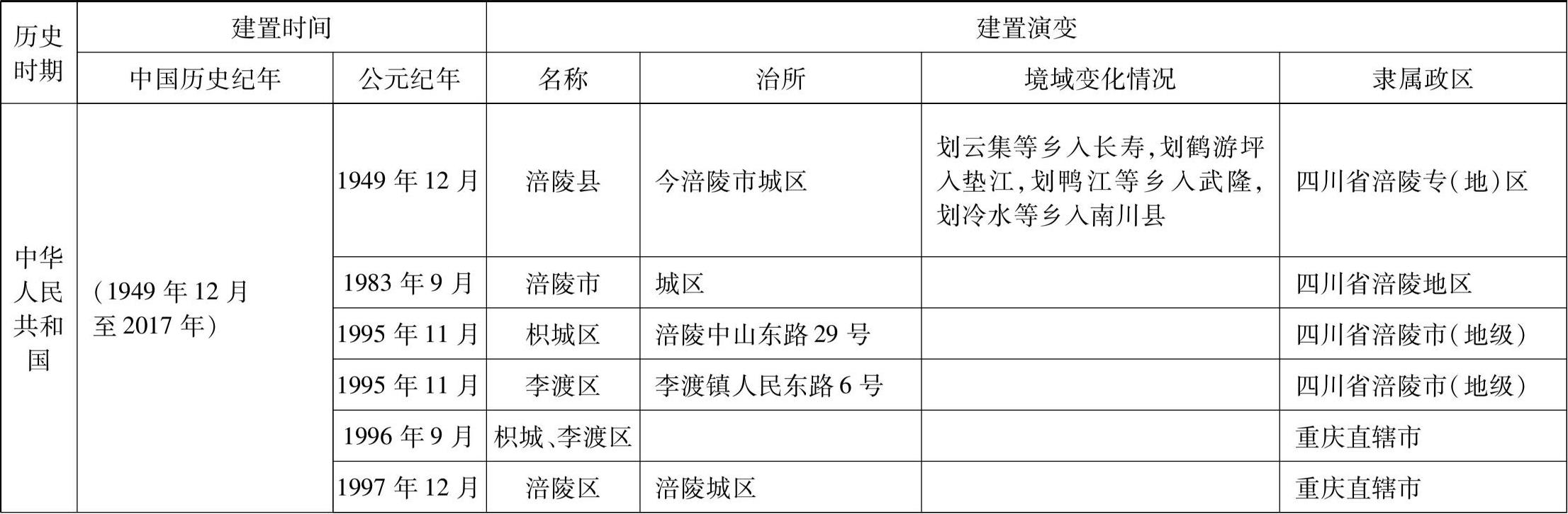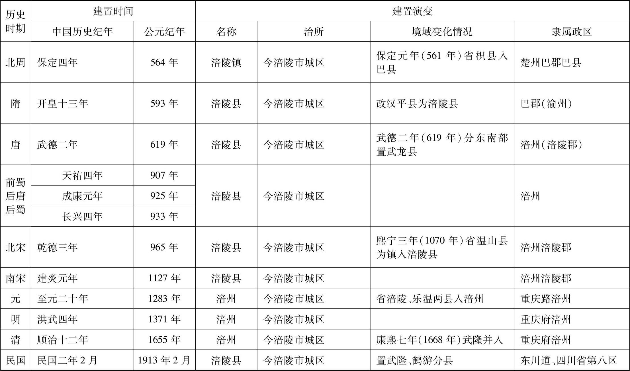 《涪陵市志》第 93 页云:南齐和帝中兴二年(502 年),萧衍代齐立梁。梁代 52 年中,蜀地先后为北朝元魏(504—508 年)、武陵王萧纪(552—553 年)割据。梁代枳县仍置,隶楚州涪陵郡,治今乌江东岸凉塘乡境内。《涪陵区建置沿革》第 2 页同。《四川省涪陵县地名录》第 1 页云:梁于枳县置涪陵郡,属楚州,辖枳和汉平 2 县。
