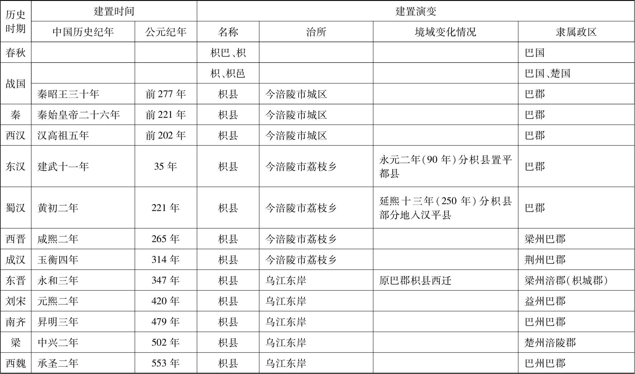 《涪陵市志》第 93 页云:梁元帝承圣二年(553 年),西魏定蜀。置枳县隶巴州巴郡,治今乌江东岸凉塘乡境内。《涪陵区建置沿革》第 3 页同。《四川省涪陵县地名录》第 1 页云:西魏仍置枳县。
