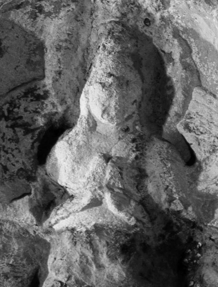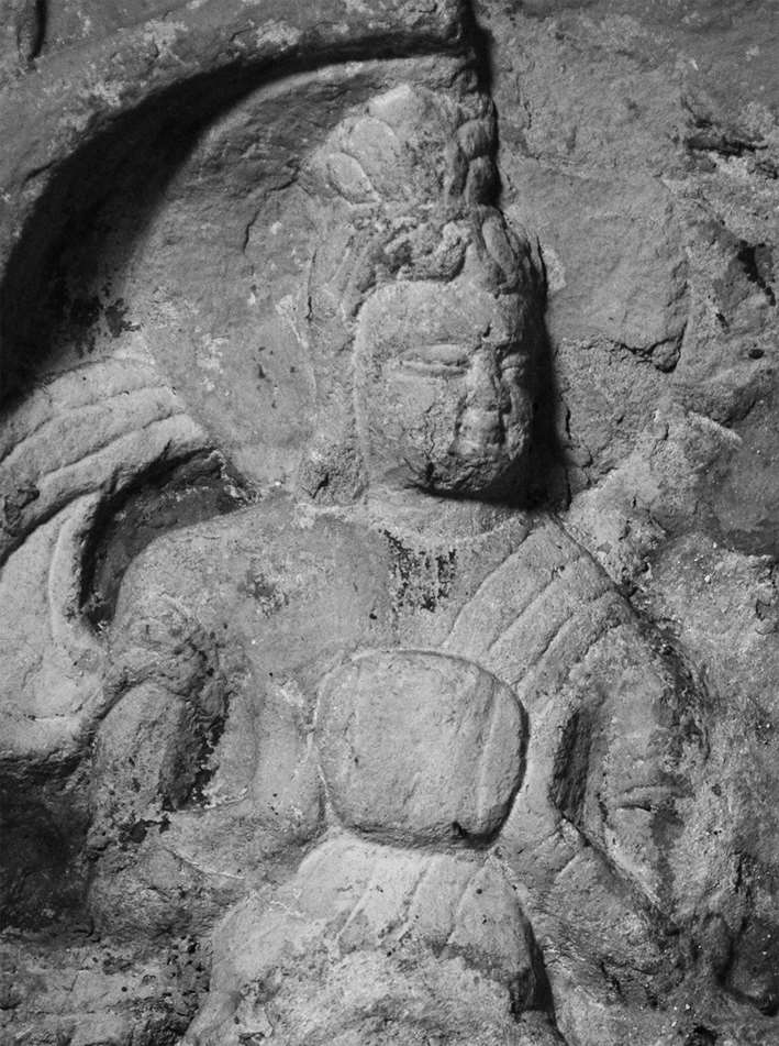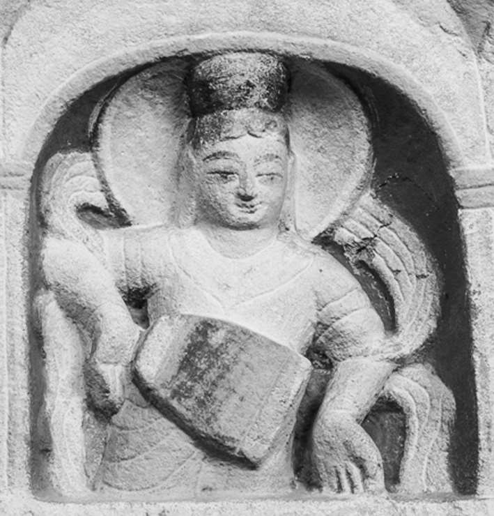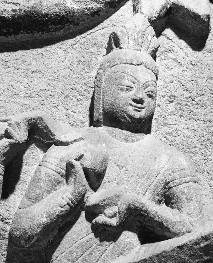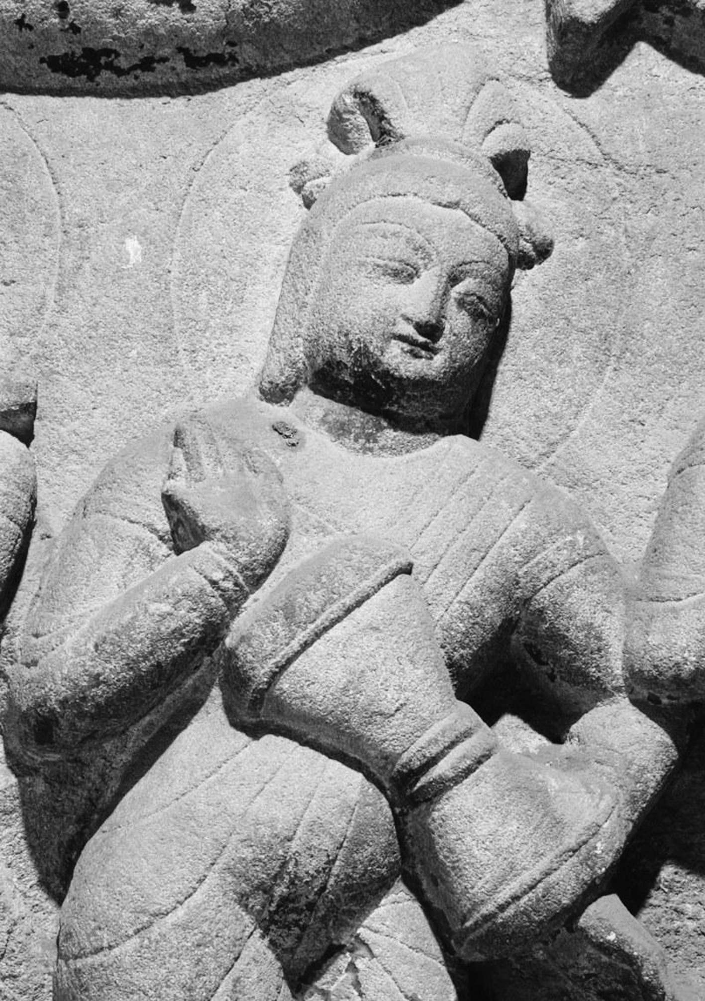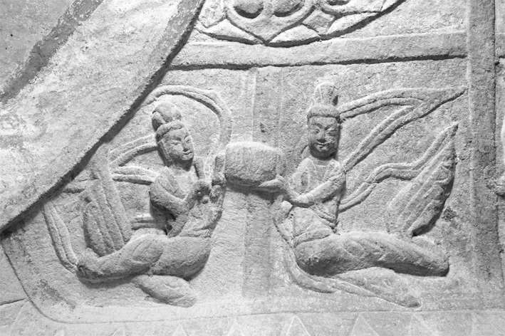 在笔者对云冈乐器的调查中,碰铃这种至今还在乐队中普遍使用的打击乐器,只在第 2 窟和第 6 窟的天宫乐伎中各有 1 身乐伎演奏碰铃,但二图均因风化原因,乐伎肢体及其乐器形态并不十分明显(见图 9)。雕刻数量如此极少的原因,大概是将这种身材小巧的打击乐器作为乐器中的配角了。