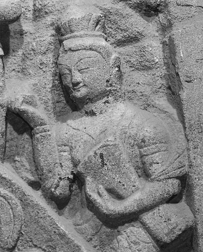 对于云冈的毛员鼓雕刻的判定,以上三条中的第二条似有参考价值。古人既然能够将都昙鼓作为参照来比较毛员鼓,说明二者的共同点较多。由此推定,“似腰鼓”,即毛员鼓亦似腰鼓,而“以槌击之”,即使用楗槌演奏而非以手掌拍击。如此,笔者虽然在云冈的调查中,只发现 4 处具备此种“似腰鼓”而“以槌击之”的乐伎演奏鼓的雕刻,但它们的共同点是以左手臂揽挎鼓身,右手持楗或持圆形物,作演奏状。其中,出现在第 16 窟南壁西侧坐佛圆拱龛龛楣左上隅的乐伎演奏毛员鼓最为典型(见图 6)。