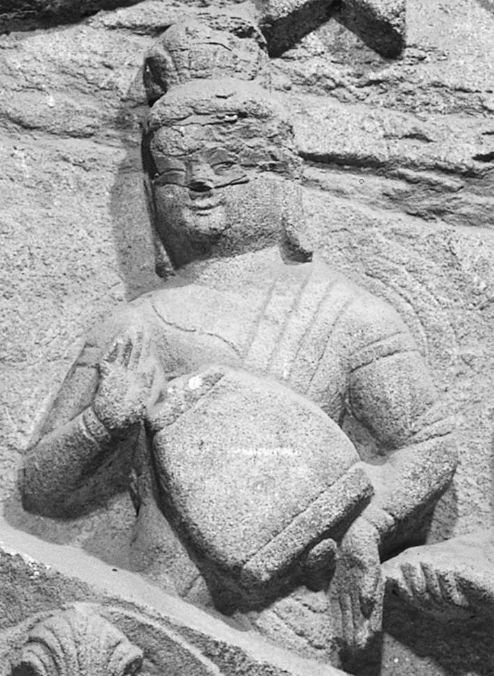 图6 第 16 窟南壁西侧坐佛像圆拱龛龛楣左上隅乐伎演奏毛员鼓