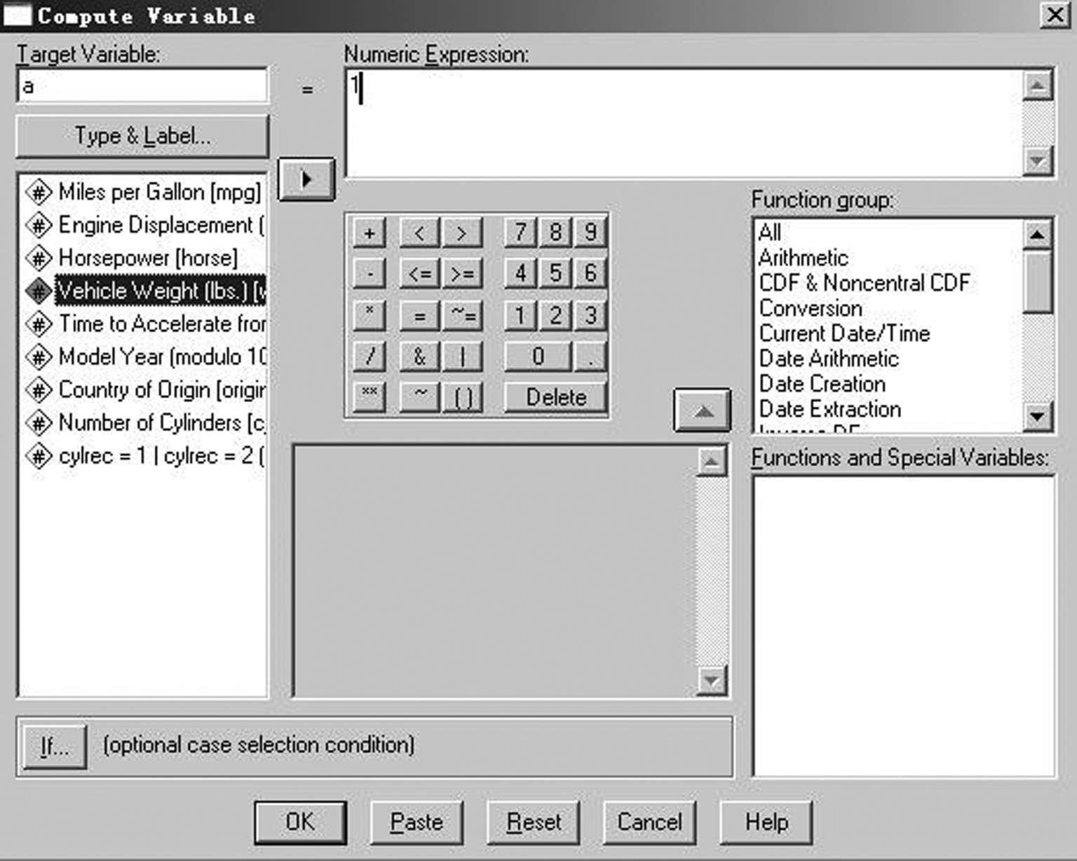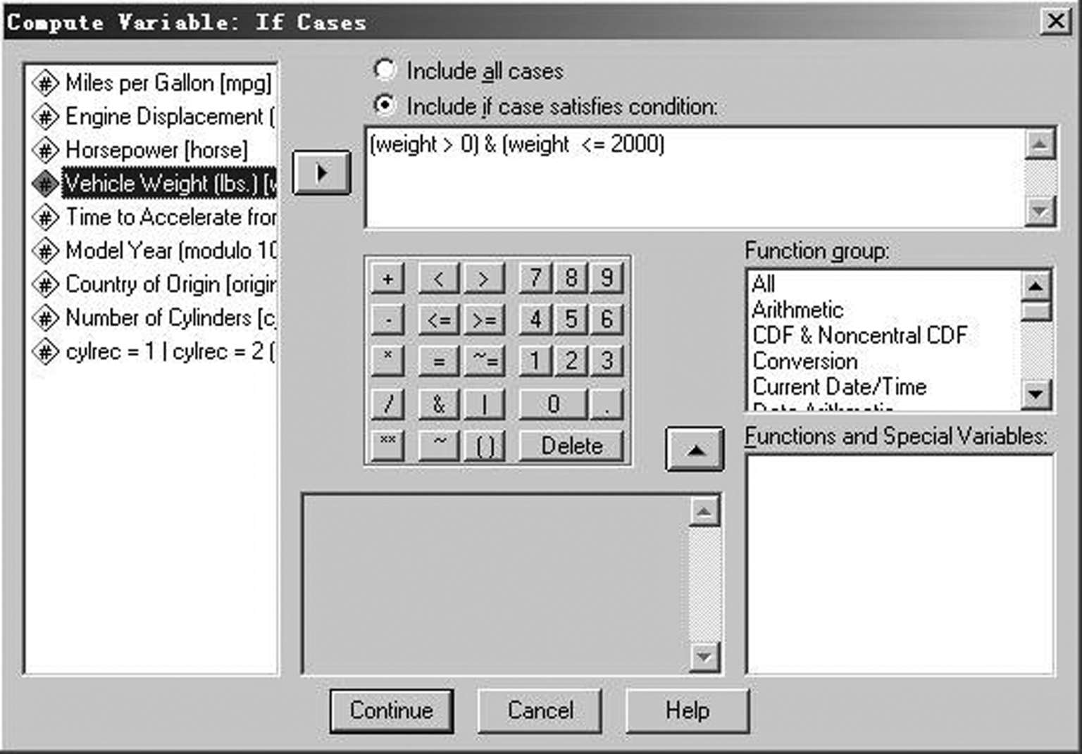 “Numeric Expression”(数值表达式)框用于输入计算目标变量值的表达式。分组时,第一次操作输入“1”,表明a = 1,计算器板下面有个“If”按钮,单击该按钮打开条件表达式对话框,如图 2-3 所示。在条件表达式对话框中指定一个逻辑表达式。在该图中,只对满足“[weight > 0]&[weight < = 2000]”(汽车重量在 0 和2000 之间,不包括 0 但包括 2000)条件的样本进行计算,符合该条件的赋值为a =1,依次类推该操作根据需要进行分组,最后新产生的变量a为分类变量。