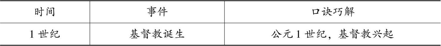 “基督教诞生”是世界历史上的大事,口诀巧解为“公元 1 世纪,基督教兴起”。学生通过口诀的念读,轻松愉快地记住了这个历史大事件。