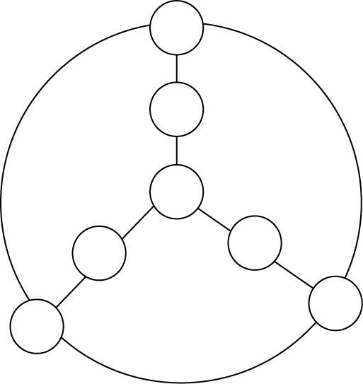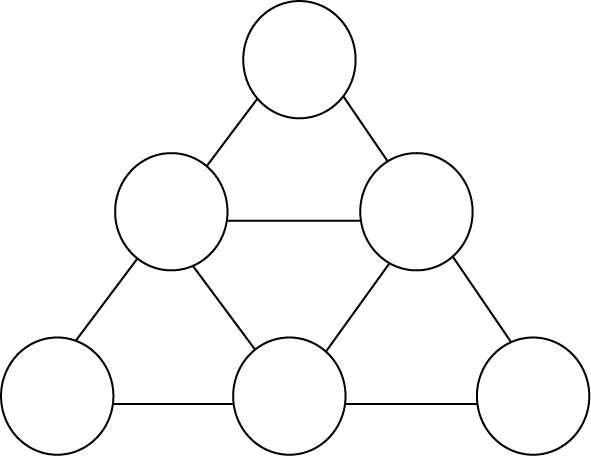 把 1、2、3、4、5、6、7 分别填入图中各〇内,使每条线段上的三数之和相等。(图 69)