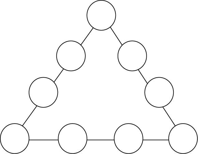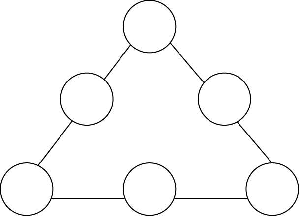 把1、2、3、4、5、6 分别填入图中各○内,使三角形每边上三数之和都相等。(图74)