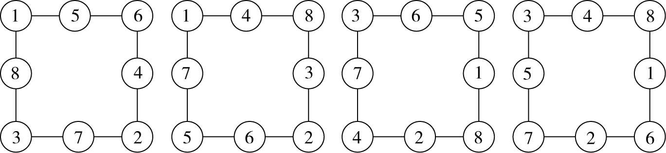 四条边上相等的“三数和”的和必定是 4 的倍数;所给八数和 36 是 4 的倍数。可见,各多使用了一次的四顶点上的数,(1)至少要取 1、2、3、6(它们的和 12 是 4的倍数),此时每边三数和为(36+12)÷ 4=12;(2)至多取 3、6、7、8(它们的和 24是 4 的倍数),此时每边三数和为(36+24)÷ 4=15。由(1)、(2)可知,本例至少有每边和为 12、13、14、15 的四个基本解。