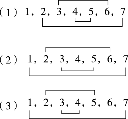 中心〇内的数是重复使用在三条线段上的,其余 6 个〇内的数都只使用一次。只要上、左、右各一对数的和相等,则三条线段上的三数之和也就相等了。请看(图 70)