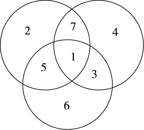 把 1、2、4、6 分别填入图中各空白区域内,使每个圆内四数之和都是 15。(图78)