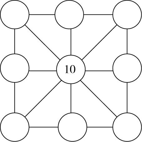 有时,如果可能的话,我们也刻意避开“重复”(化纷繁为单纯)去求未知的“相等之和”。如爱因斯坦做过的题里,我们不在错综重叠的 7 个三角形之间纠缠,而只挑选倒置的 3 个三角形“▽”。这 3 个三角形不重复、不遗漏地涉及全部 9个数。于是可以轻而易举地求得每个三角形顶点上的三数和。