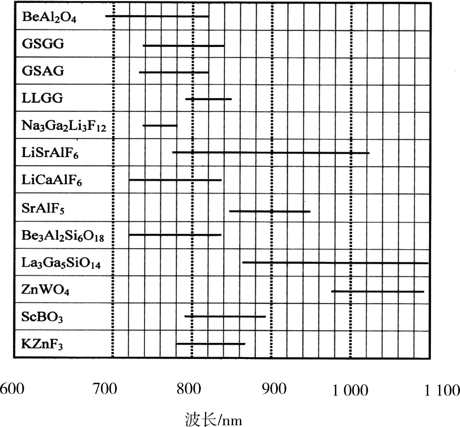 可调谐激光晶体覆盖了690 ~ 1 100 nm波谱区域,如图 1.2 所示。为什么已成功实现可调谐激光输出的晶体材料大多是掺