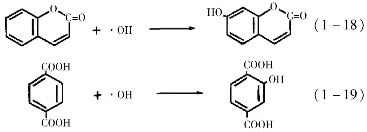 其中·OH具有很强的氧化性,通过实验和理论的方法均可以确定光催化过程中·OH的存在。电子顺磁共振(EPR)和荧光光谱法(PL)是检测·OH自由基的常用手段 [6-7] 。如图1-4所示是TiO 2 在紫外光照射下DMPO(5,5-二甲基-1-吡咯啉-N-氧化物)捕获的EPR信号,在光照下样品出现DMPO-·OH加合物的EPR特征信号,即1∶2∶2∶1的四重峰,且信号的强度随着光照时间的延长不断增强,从而证明·OH的浓度在光照下不断增加。化学法检测·OH主要是利用有机物本身无荧光性能,但和·OH加合后具有较强的荧光性能这一特性,常用的有机物为香豆素和对苯二甲酸 [9] ,式(1-18)、(1-19)所示为香豆素和对苯二甲酸的分子结构式以及与羟基自由基加合后的产物,所得的加合产物具有较强的光致发光特性,光致发光的强度与羟基自由基的浓度呈线性关系,可以定性地检测羟基自由基的浓度变化。普遍认为·OH自由基的形成机理是空穴氧化机制,也就是说空穴与催化剂表面的羟基[式(1-9)]或水分子反应而得,然而最近也有研究证明,空穴不能直接氧化水分子得到·OH自由基,而可能是空穴通过亲核攻击氧化晶格氧得到·OH自由基 [10] 。·OH自由基具有能氧化大部分的有机污染物及部分无机污染物的能力,并可将污染物最终降解为CO 2 、H 2 O等无害物质。由于·OH对反应物几乎没有选择性,因而在光催化氧化中起着关键性的作用。表1-3给出了各个氧化物质的氧化能力对比和氧化电势电位,从表中可以看出·OH的氧化电位为2.80V,比作为消毒杀菌剂被广泛使用的次氯酸、过氧化氢和臭氧等具有更强的氧化能力。