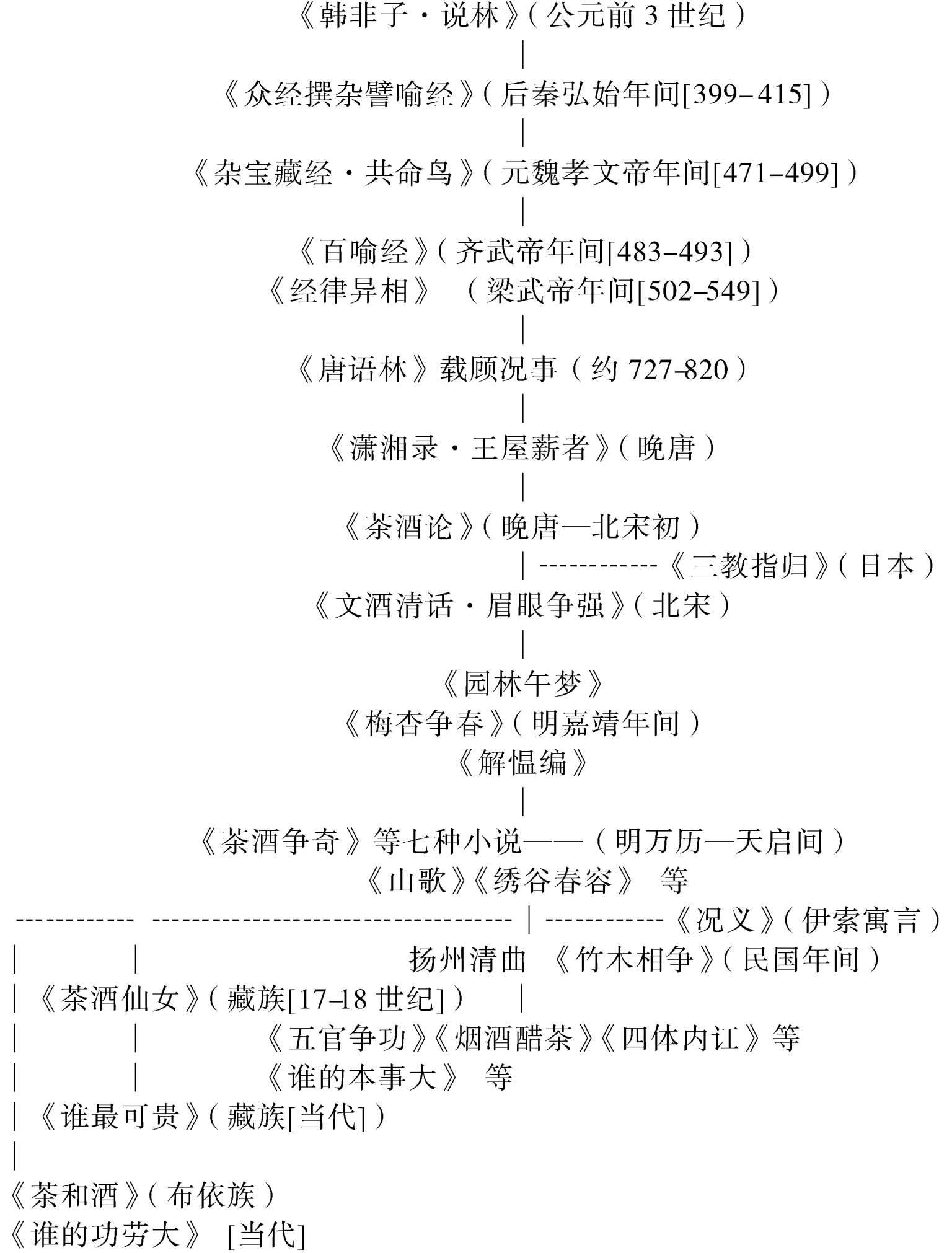 这一共命鸟故事,与韩非子的虺两口故事有异曲同工之妙。异域故事的传入,更加激发了中土故事的创造。此即鲁迅先生所说:“魏晋以来,渐译释典,天竺故事亦流传世间,文人喜其颖异,于有意或无意中用之,遂蜕化为国有。”特别是到了唐代,由于封建经济的昌盛,社会生活的繁荣,文化艺术的昂扬,对外交往的频繁,在这种历史背景下,《茶酒论》出现了。