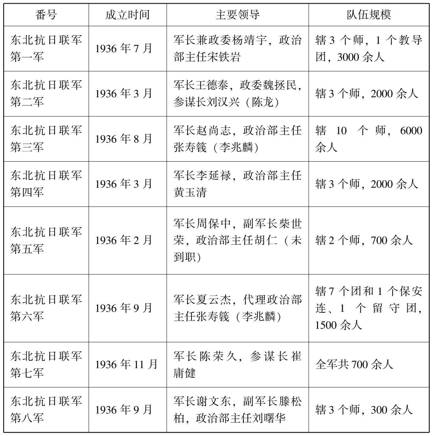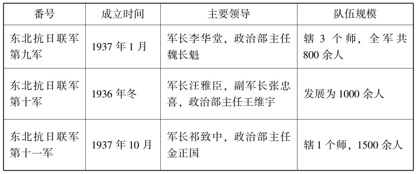 东北抗日联军共有 11 个军,人数最多时有 3 万多人,其中,第一、二、三、六、七军是在反日游击队(共产党领导)的基础上建立的;第四、五军是在王德林的救国军、李杜的抗日自卫军余部的基础上建立的;第八、九、十、十一军是在义勇军余部和抗日山林队的基础上建立的