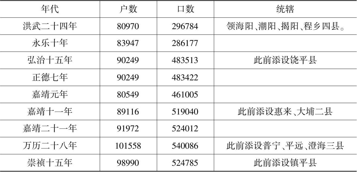 潮州的前身是汉代的揭扬县。“大明洪武二年,省梅州改为潮州府”,所以,明代的潮州管辖宋元时期的潮州及梅州,疆域较广。“置潮州卫守焉”。明代前期潮州管辖的县为:海阳、潮阳、揭阳、程乡。《元史·地理志》记载潮州人口为 63650户、445550 人,明代初年,尽管梅州已经划拨潮州,但洪武十年(1377 年)潮州的人口仅有:60097 户,214404 口。