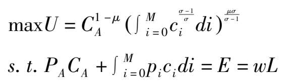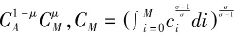 其中, C M 表示消费者对制造业产品的消费组合, C A 表示消费者对农产品的消费, μ 和1- μ 分别代表消费者在制造业产品和农产品上的支出份额。由于制造业产品是多样化的异质产品,消费者对其的消费是对某种制造业产品组合的消费,它的消费函数是不变替代弹性的, σ 表示不同制造业产品之间相对不变的消费替代弹性,其大小满足0< μ <1< σ 。 c i 则是消费者对制造业产品消费组合中第 i 种制造业产品的消费数量。
