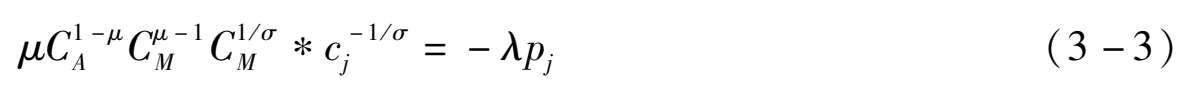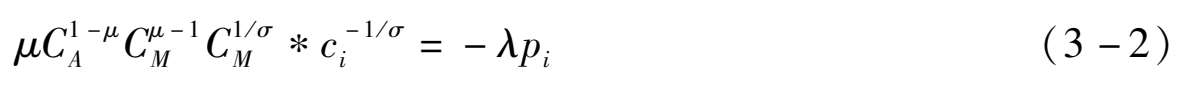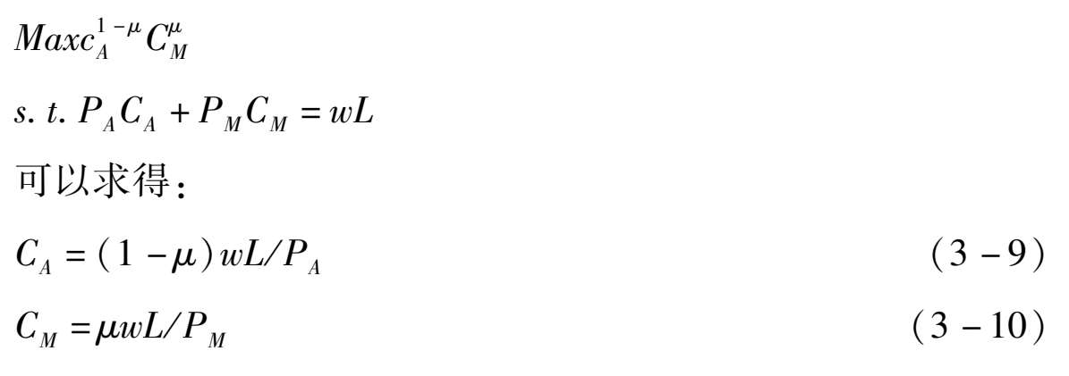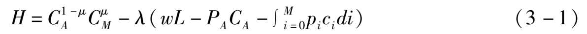 其中, P A 和 p i 分别表示农产品和第 i 种制造业产品的价格, E 为居民全部要素收入。为了求解上式,建立拉格郎日函数如(3-1)式: