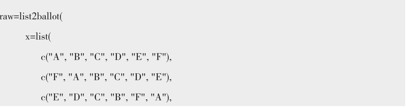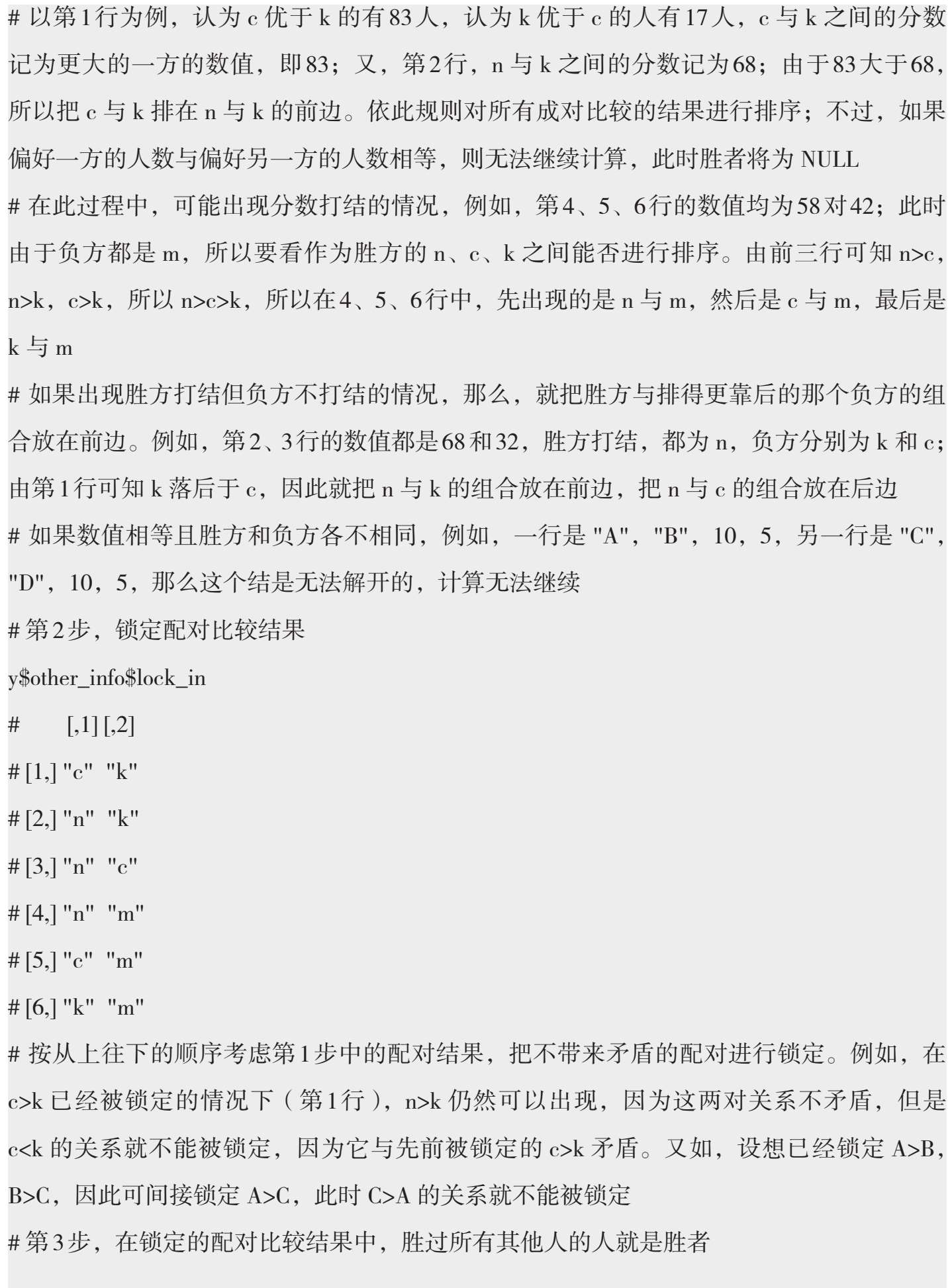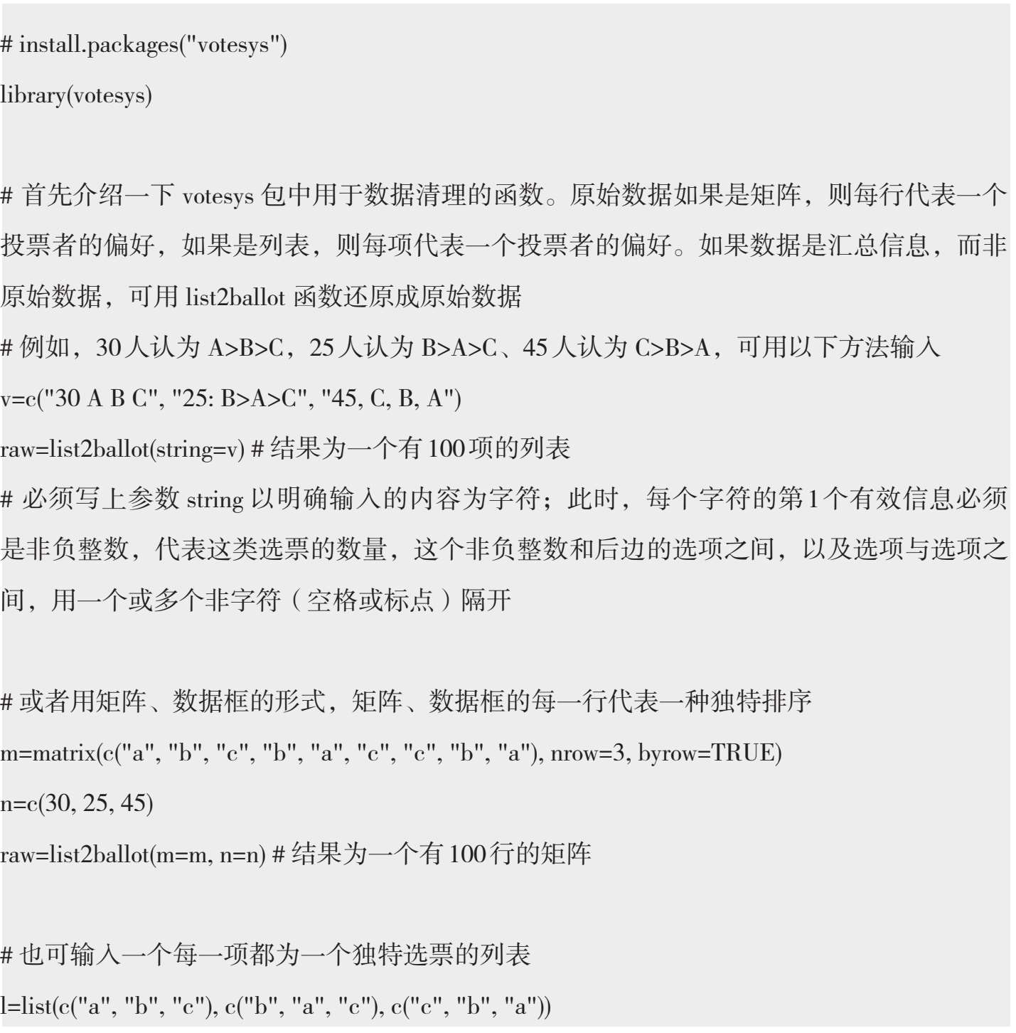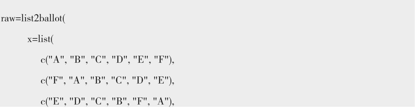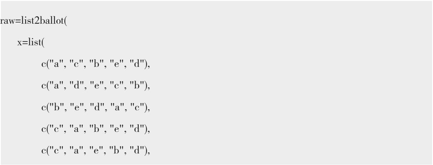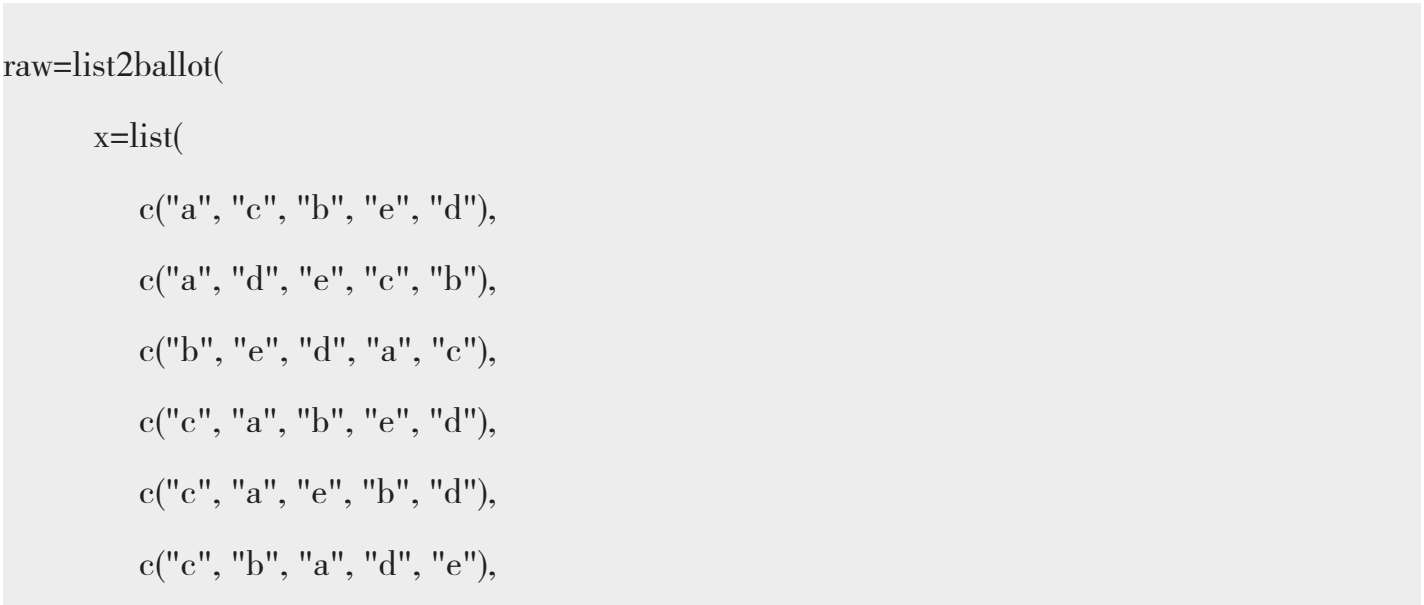 本章接下来的内容将按照涉及的R包和函数分成三个部分:我们将首先讨论投票计票方法,这些方法均可划分到上述分类中的启发式方法中;计算时用到的函数主要是R中的基本函数和votesys包中的函数。接着,我们会介绍用于分析主观排序和客观排序的Bradley-Terry模型、模式模型和Plackett Luce模型;拟合这些模型的目的是探究排序与主客观因素之间的关联,或对比较/评比结果进行预测;尽管这些模型并不属于上述三种共识排序方法,但它们仍然会在输出结果中给出相对排序。最后一部分将对R包中用于实现共识排序算法的多个函数进行介绍。