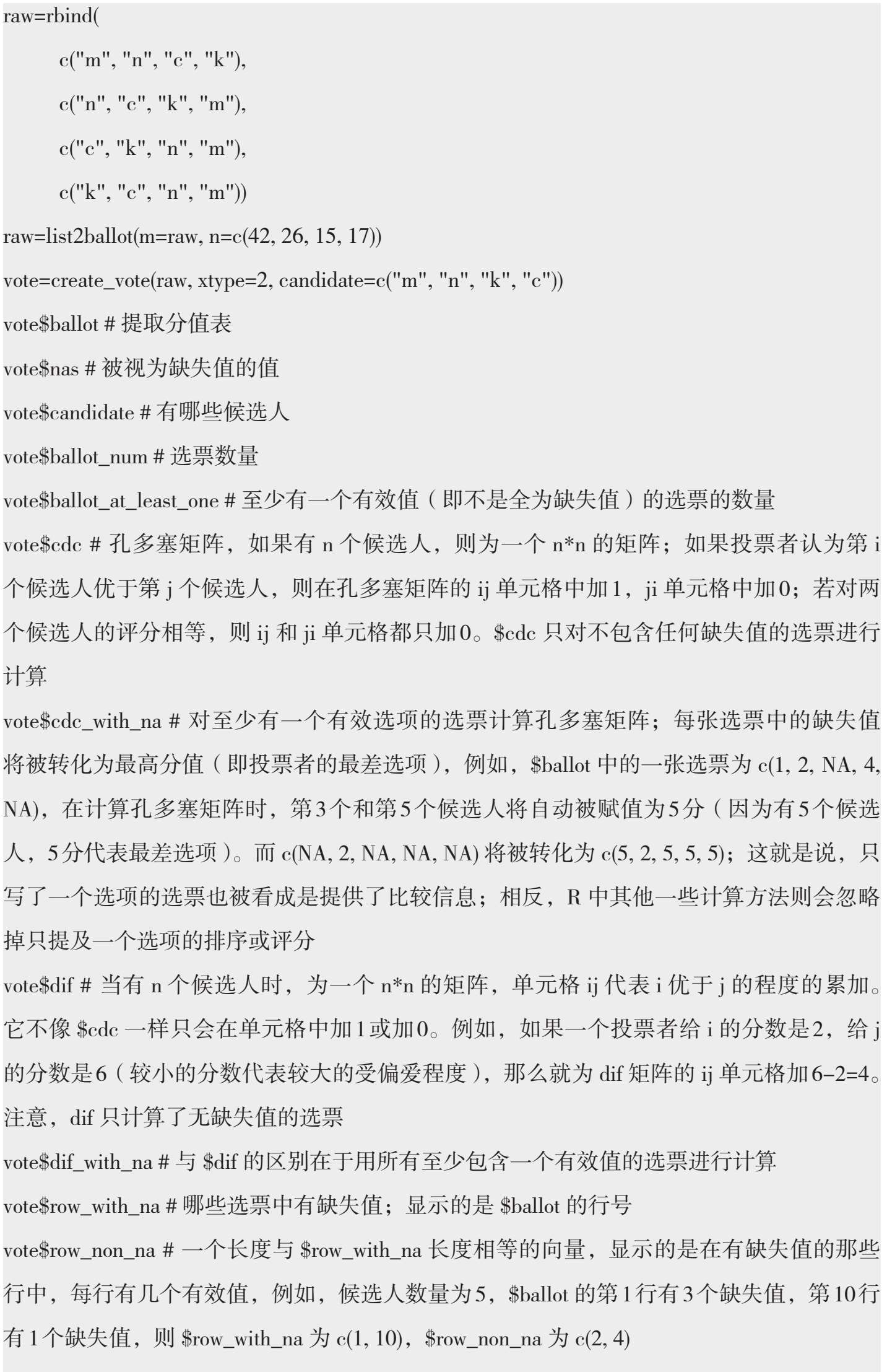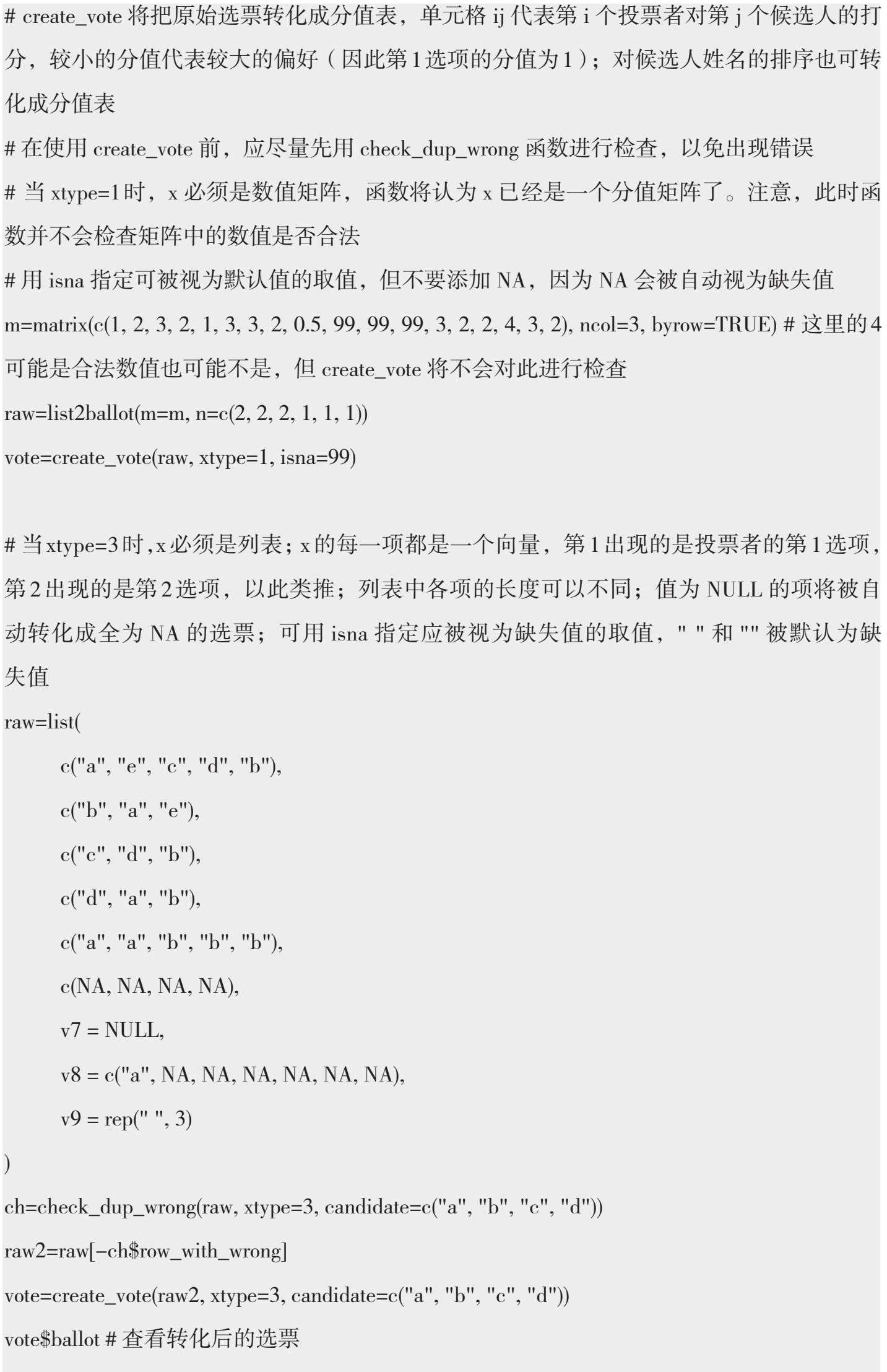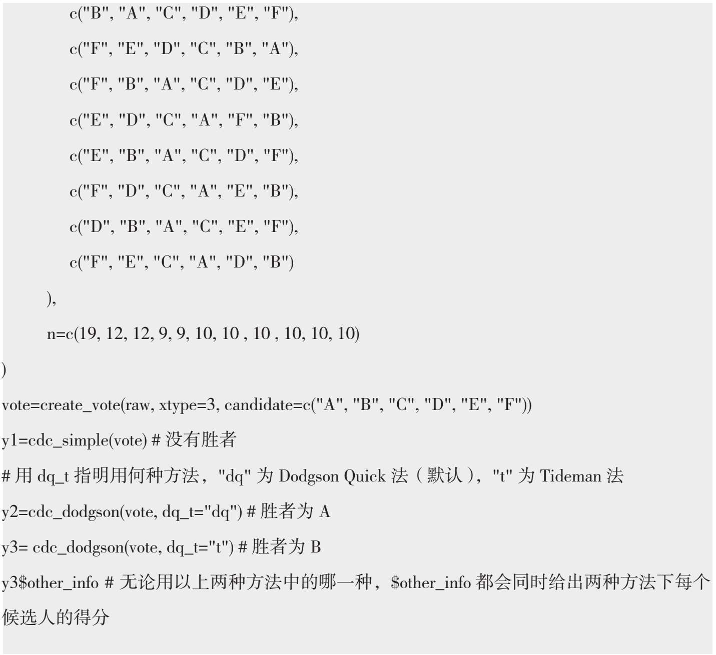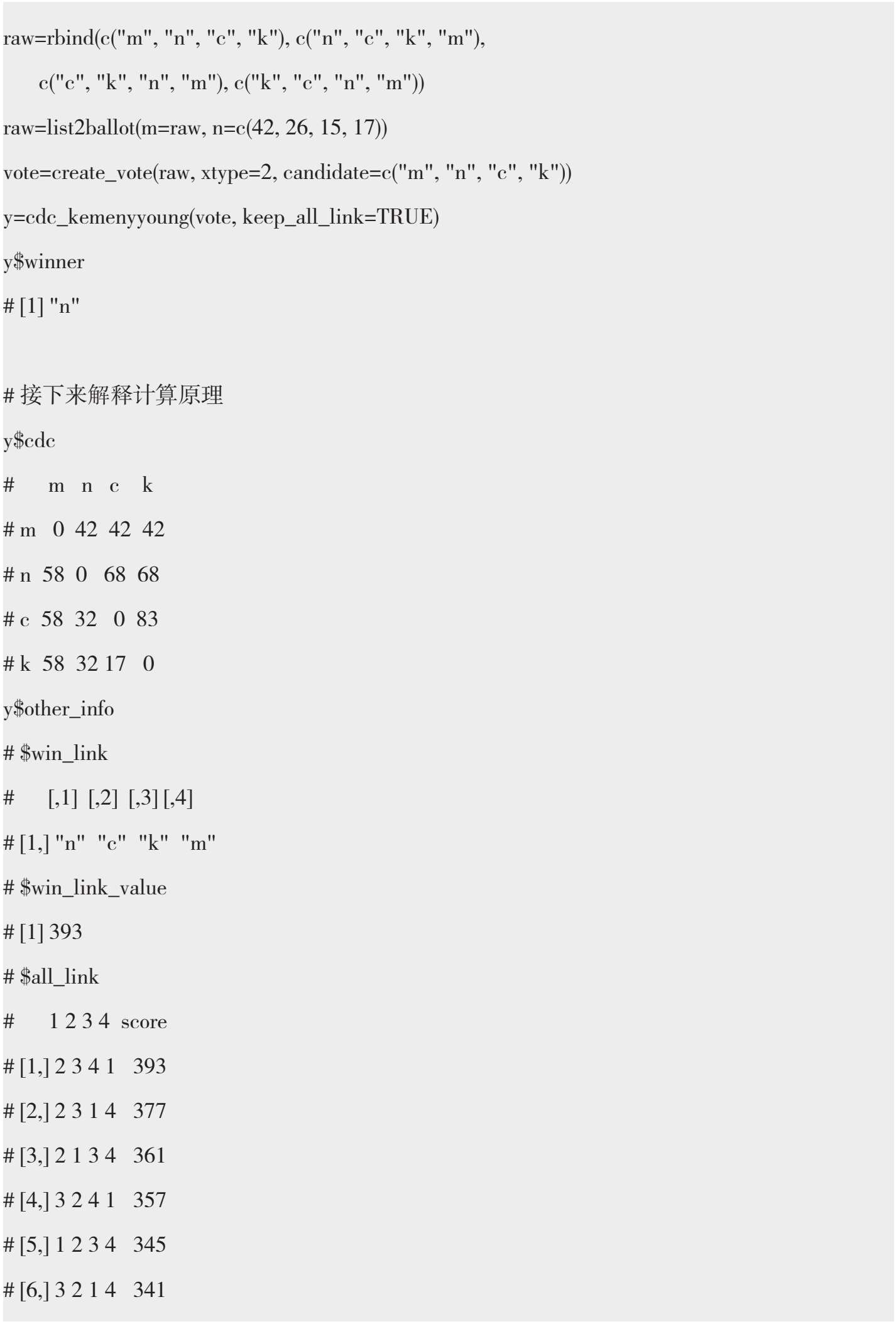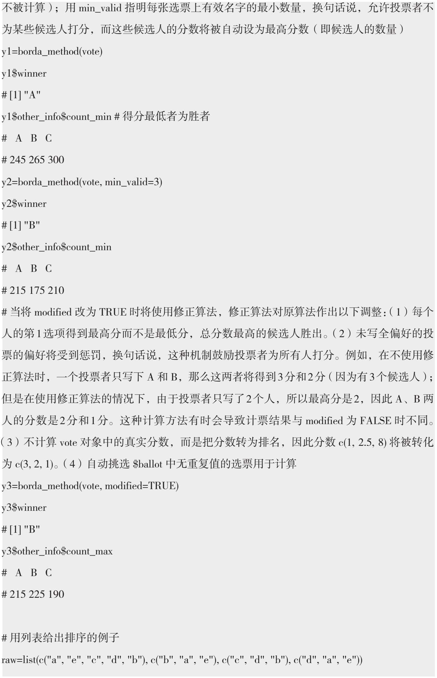 本章接下来的内容将按照涉及的R包和函数分成三个部分:我们将首先讨论投票计票方法,这些方法均可划分到上述分类中的启发式方法中;计算时用到的函数主要是R中的基本函数和votesys包中的函数。接着,我们会介绍用于分析主观排序和客观排序的Bradley-Terry模型、模式模型和Plackett Luce模型;拟合这些模型的目的是探究排序与主客观因素之间的关联,或对比较/评比结果进行预测;尽管这些模型并不属于上述三种共识排序方法,但它们仍然会在输出结果中给出相对排序。最后一部分将对R包中用于实现共识排序算法的多个函数进行介绍。