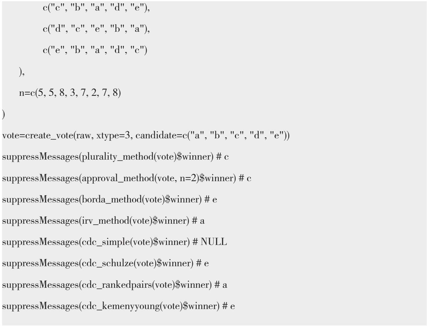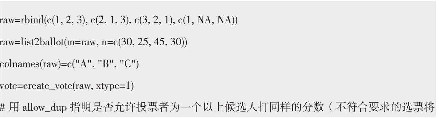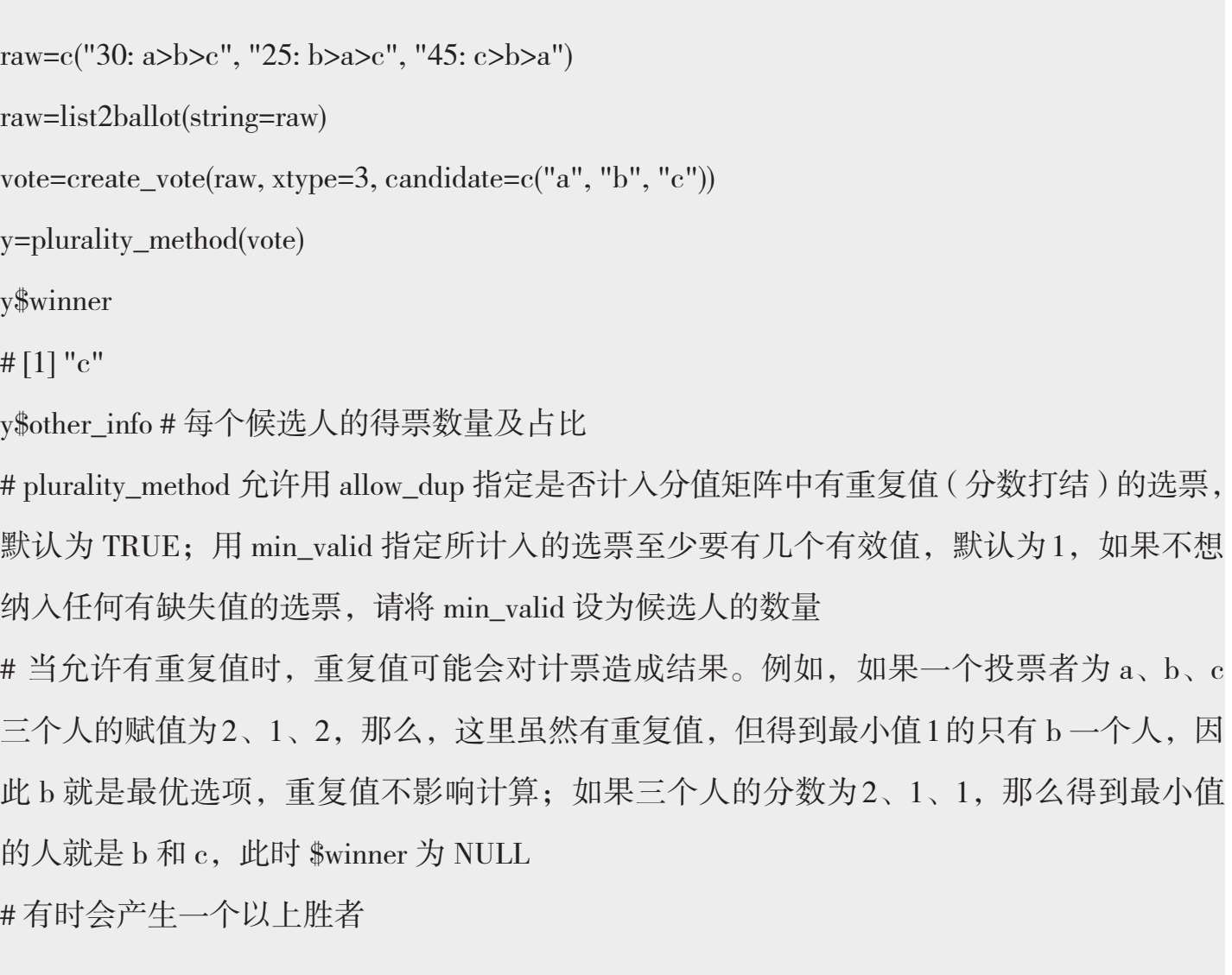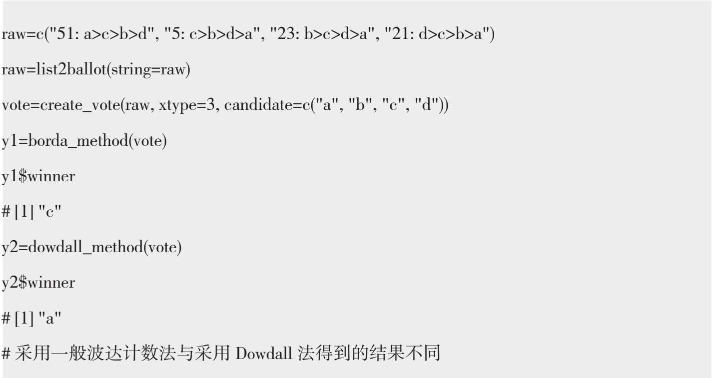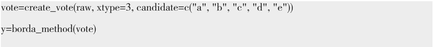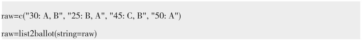 使用多数制时,可直接用table函数计算,也可将偏好数据转化成vote对象再计算,以便对比不同算法的结果。