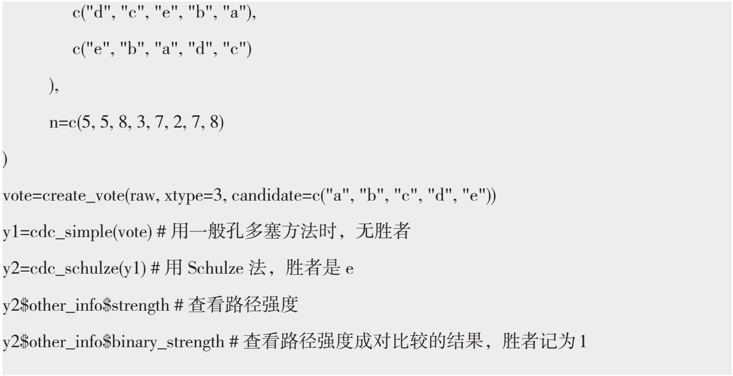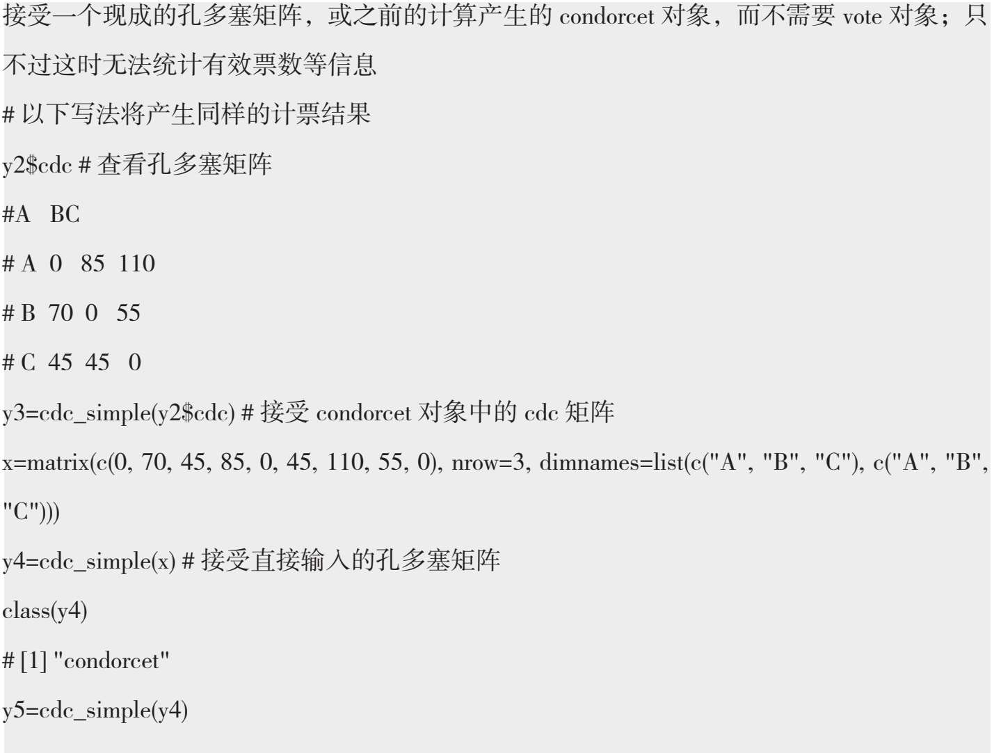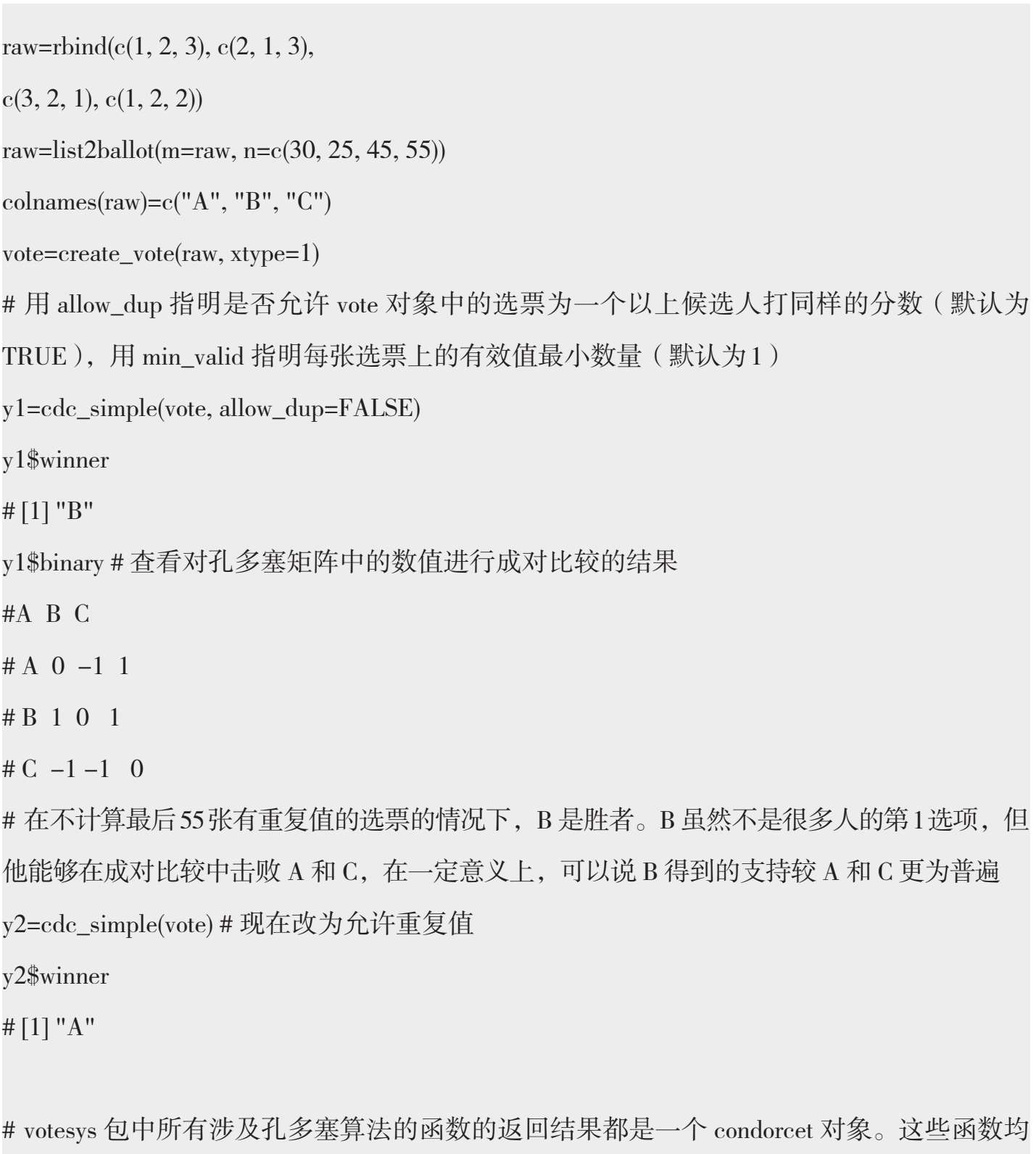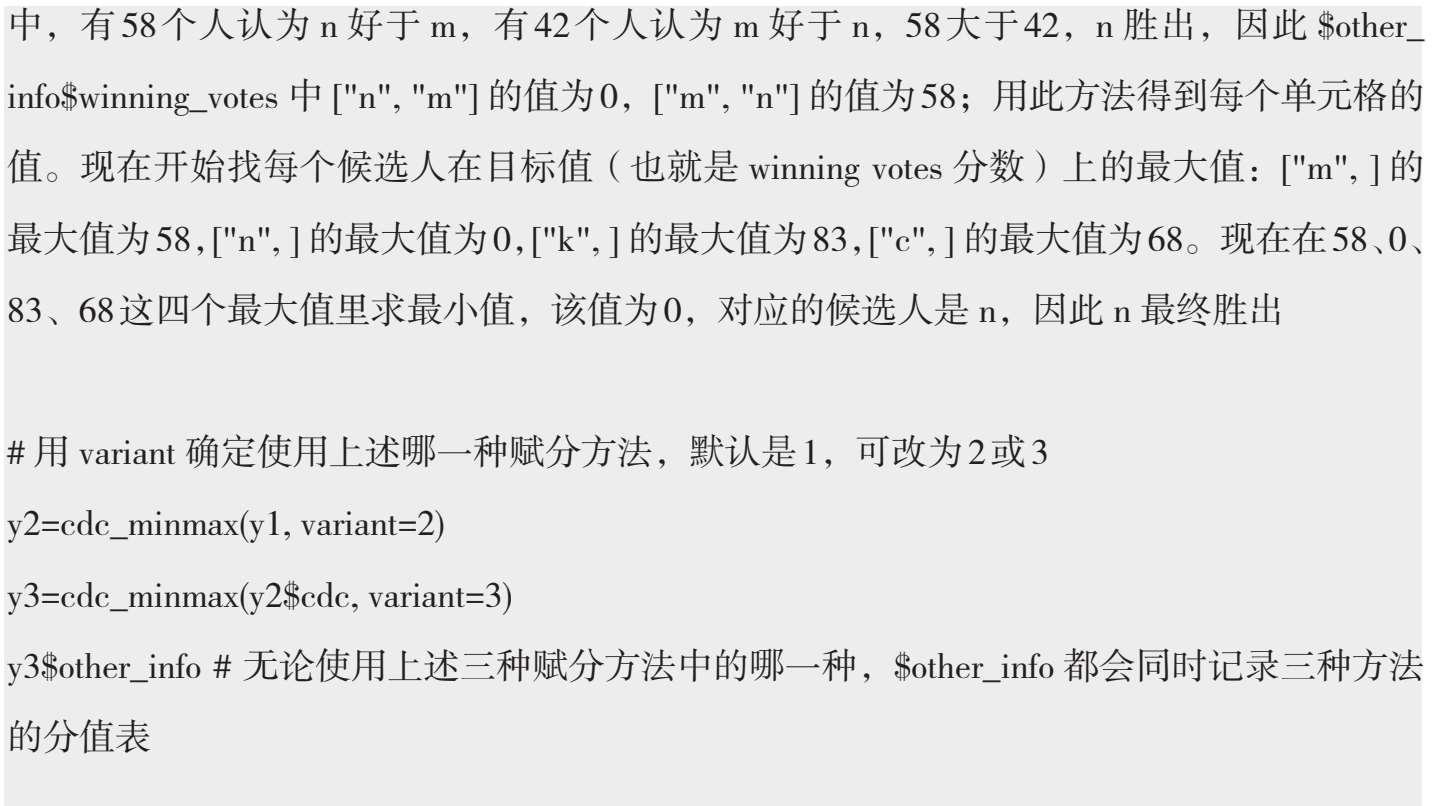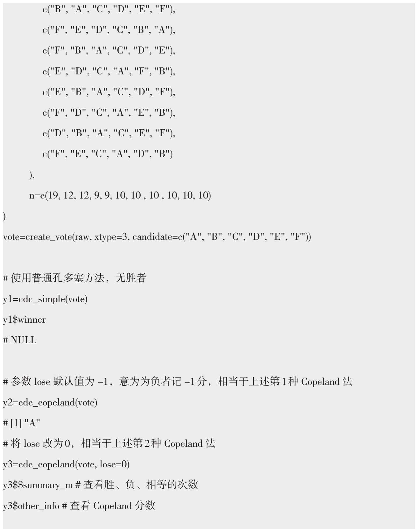 为解决无法选出胜者的问题,人们又在简单孔多塞方法的基础上设计出了多种变体,这些变体均可看作是广义的孔多塞方法,其中一些常用方法可用votesys包中以"cdc"开头的函数实现。