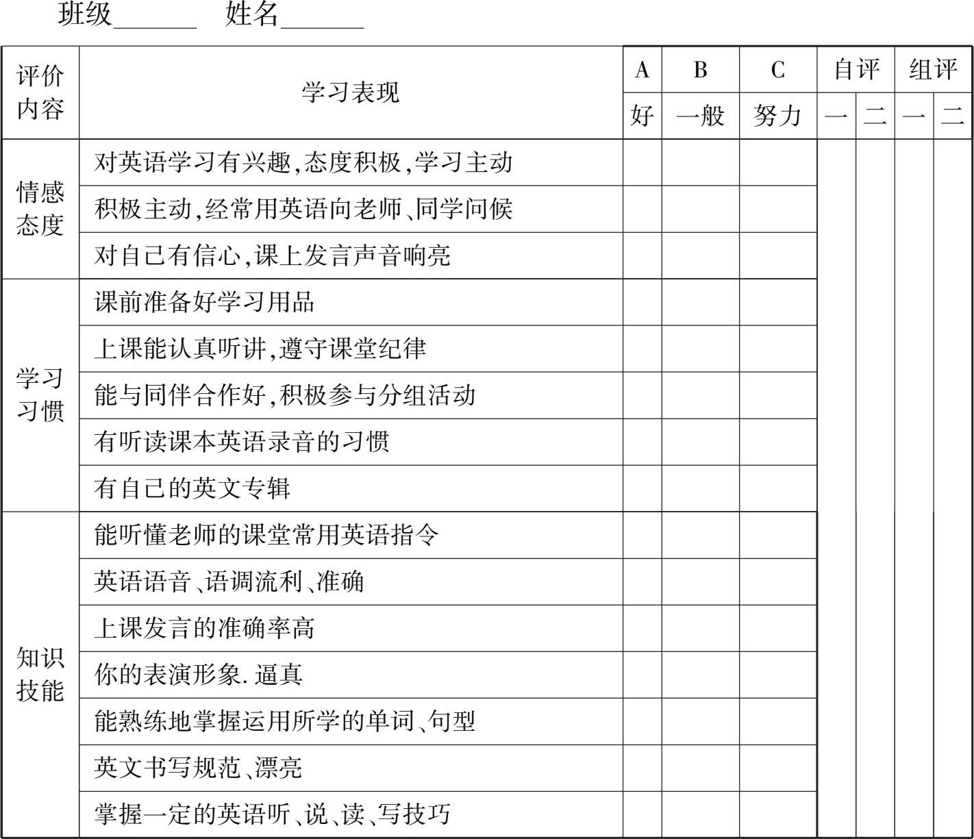 在教学中,我们要改变教师是绝对评价权威的观念,积极引导学生开展互评,把评价权还给学生。通过互评,使学生能进一步了解自己,通过和他人对比,发现自己的优缺点,从而能够全面地正视自己、尊重他人,同时能提高学生的分析判断、反思解决问题的能力,有利于激发学生的上进心。评价的内容可以包括学习态度,学习情感和学习习惯等多方面。通过这种互动评价,能有效地促进课堂教学任务的完成以及使学生养成良好的学习习惯,形成有效的学习策略,发展他们的自主学习能力和合作精神。不过,学生小组间的互评并不宜多,一学期两次左右即可。为了让学生得到更好的发展,我们引导学生自评与互评相结合。学生自评与互评的学习评价表有多种多样,下面例举其中的一种: