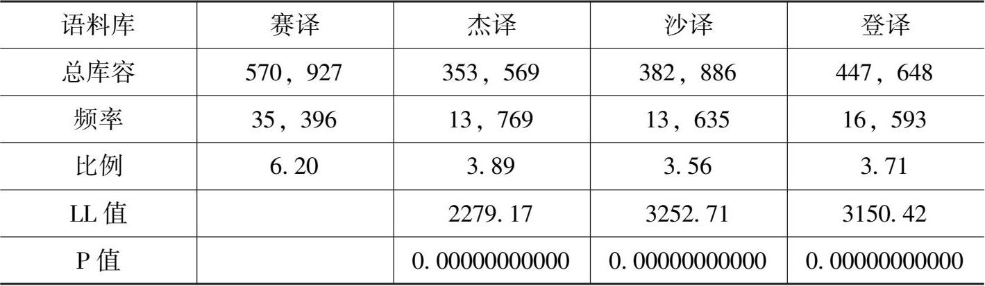 从词的排位可发现,杰译、沙译及登译排位第一的词为定冠词the,三译本表现出一致性,此词所占的百分比分别为5.77、6.19和6.43。赛译中定冠词the的比例为5.81,故四译本中the的比例没有实质上的差异。但赛译的中排第一的词and占其整个库容的百分比为6.20,而其他三个译本and均排第二,表现出一致性,且百分比分别为3.89、3.56和3.71,这些数据清楚地表明赛译中的and明显大于其他三个,对数似然检验