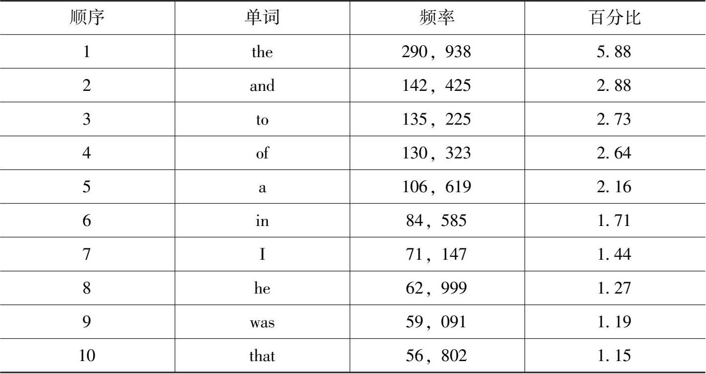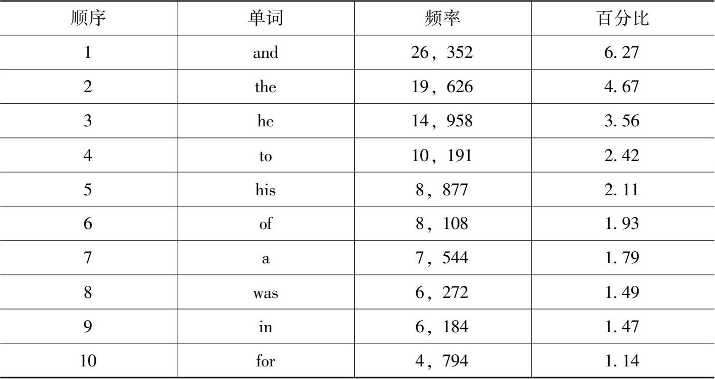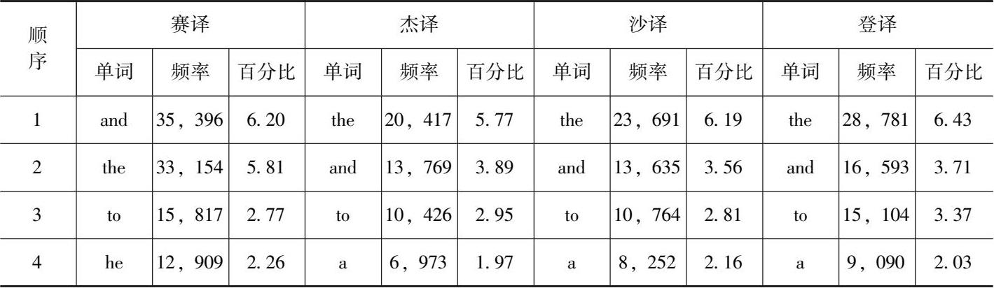 Baker(2006:47)和Scott(2010:148)均认为以词频表开始研究语料库是最佳选择。Aston(2001:30)指出基于词频表的文本分析很大程度上有助于研究作品的文体风格特征。利用Wordsmith Tools 4.0的词频统计功能,分别得出每个译本的词频表,表4.1是赛译、杰译、沙译及登译排位前10的词频与百分比对照表。