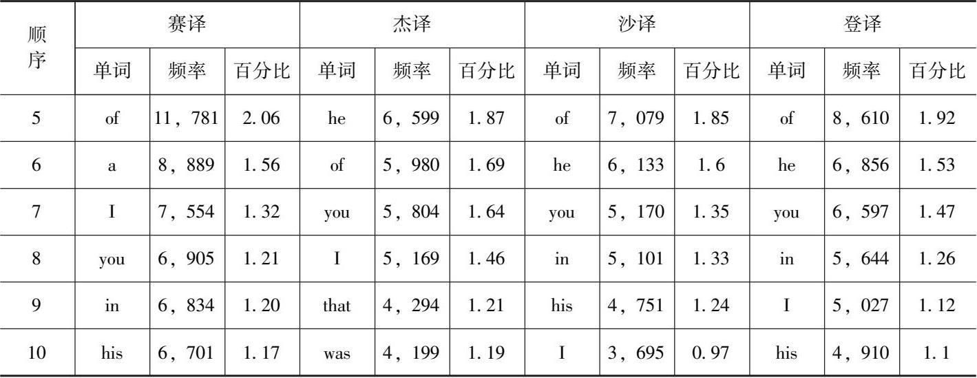 从整体上来分析,四译本前10词中赛译、沙译及登译呈现相似性,前10词相同,只是顺序有所差别,杰译除that和was不在其他三译之列,其余8词也相同,彼此间的顺序略有变化。