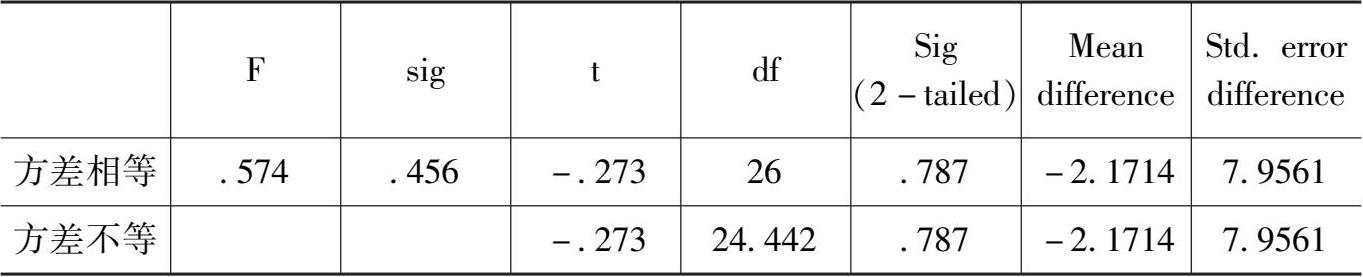 从表 4-5 中可以看出,T统计量的相伴概率-0.784 大于显著性水平0.05,不能拒绝T检验的零假设,即初二学生和大二学生的朴素认识不存在显著性差异。