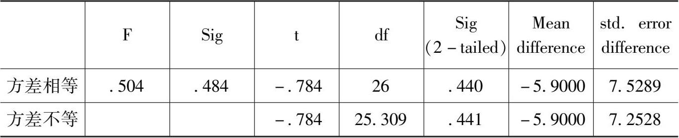 从表中可以看出,T统计量的相伴概率 0.787 大于显著性水平 0.05,不能拒绝T检验的零假设,即初二学生和高三学生的朴素认识不存在显著性差异。
