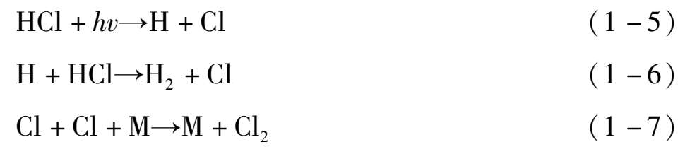 式(1-5)为初级过程。式(1-6)为初级过程产生的H与HCl反应。式(1-7)为初级过程产生的Cl之间的反应,该反应必须有其他物种如O 2 或N 2 等存在下才能发生,式中用M表示。式(1-6)和式(1-7)均属次级过程,这些过程大都是放热反应。