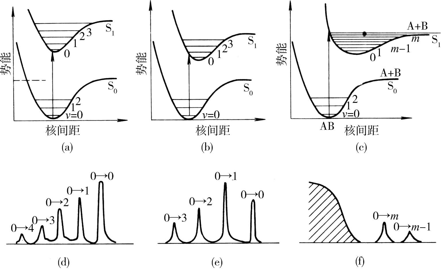 图1-5(a)中电子激发态的平衡核间距与基态的相似。根据Franck-Condon原则,只有从基态的 v =0振动能级至激发态的 v′ =0振动能级的跃迁(0→0跃迁)概率最大;由于从基态的 v =0至激发态的 v′ =1,2,…振动能级跃迁时,核间距要依次发生相当的变化,所以,在这种情况下,振动谱线以0→0跃迁的强度最大。在图1-5(b)中,根据Franck-Condon原则可以预言,不是0→0跃迁,而是01跃迁谱线的强度最大[图1-5中(e)]。有时激发态的平衡核间距位移如此之大,以致由基态 v =0出发的Franck-Condon跃迁与激发态势能曲线相交于离解渐进线之上[图1-5中(c)]。这是因为电子被激发后,分子应立即进行振动,此时原子间已无回收力,因而分子立即离解为原子。在这种情况下,向渐进线以下的不连续跃迁虽然是可能的,但强度不大[图1-5中(f),0→m,0→m-1等];向渐进线以上的跃迁由于没有量子化条件的限制(能量不是分立的),而呈现为连续的吸收谱。这时电子跃迁导致分子的离解,至少离解产物之一处于激发态。
