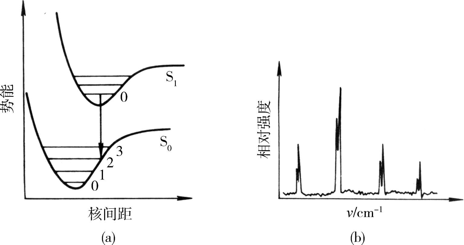 分子中的电子跃迁时伴随有转动和振动能级的变化,这种变化构成了吸收光谱的振动精细结构。与电子跃迁不同,从分子中的一个电子态至另一个电子态时,对振动能级的变化没有选则,因而从基态 S 0 的 v =0振动能级至 S 1 态中任何一个振动能级的跃迁均为可能,但是振动精细结构中各谱线的相对强度都可以由Franck-Condon原则来决定。