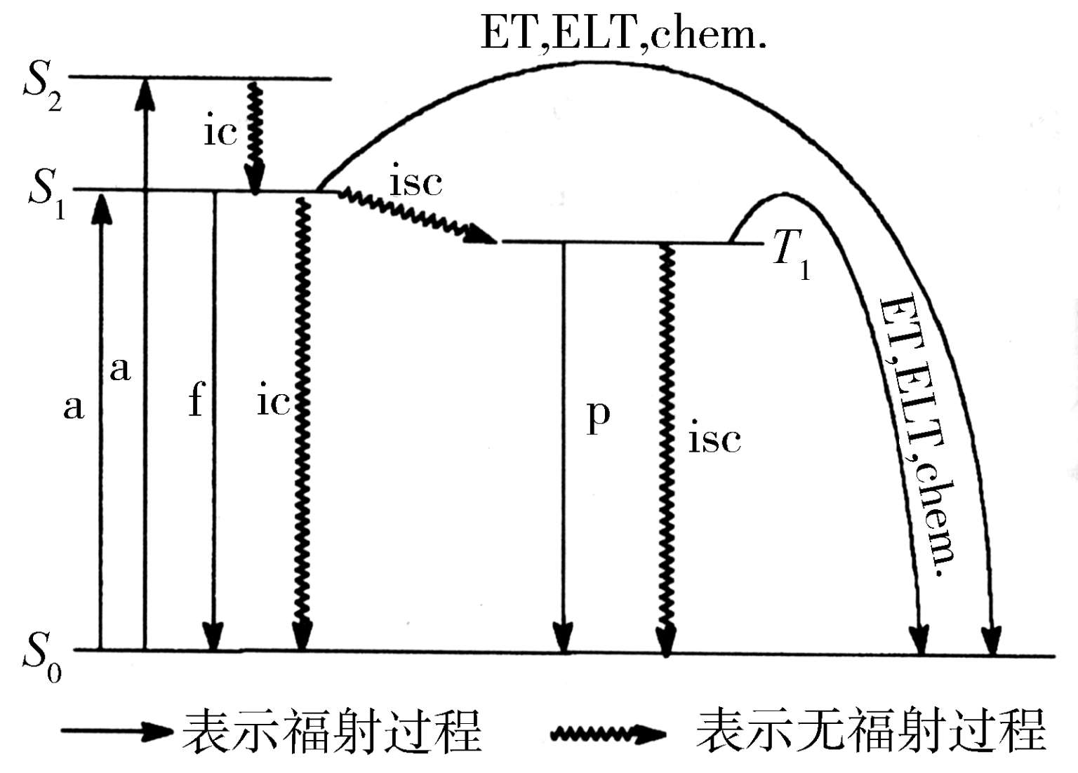 (a)吸收;f—荧光;p—磷光;ic—内转换;isc—系间窜越;ET—能量传递;ELT—电子转移;chem .—化学反应
