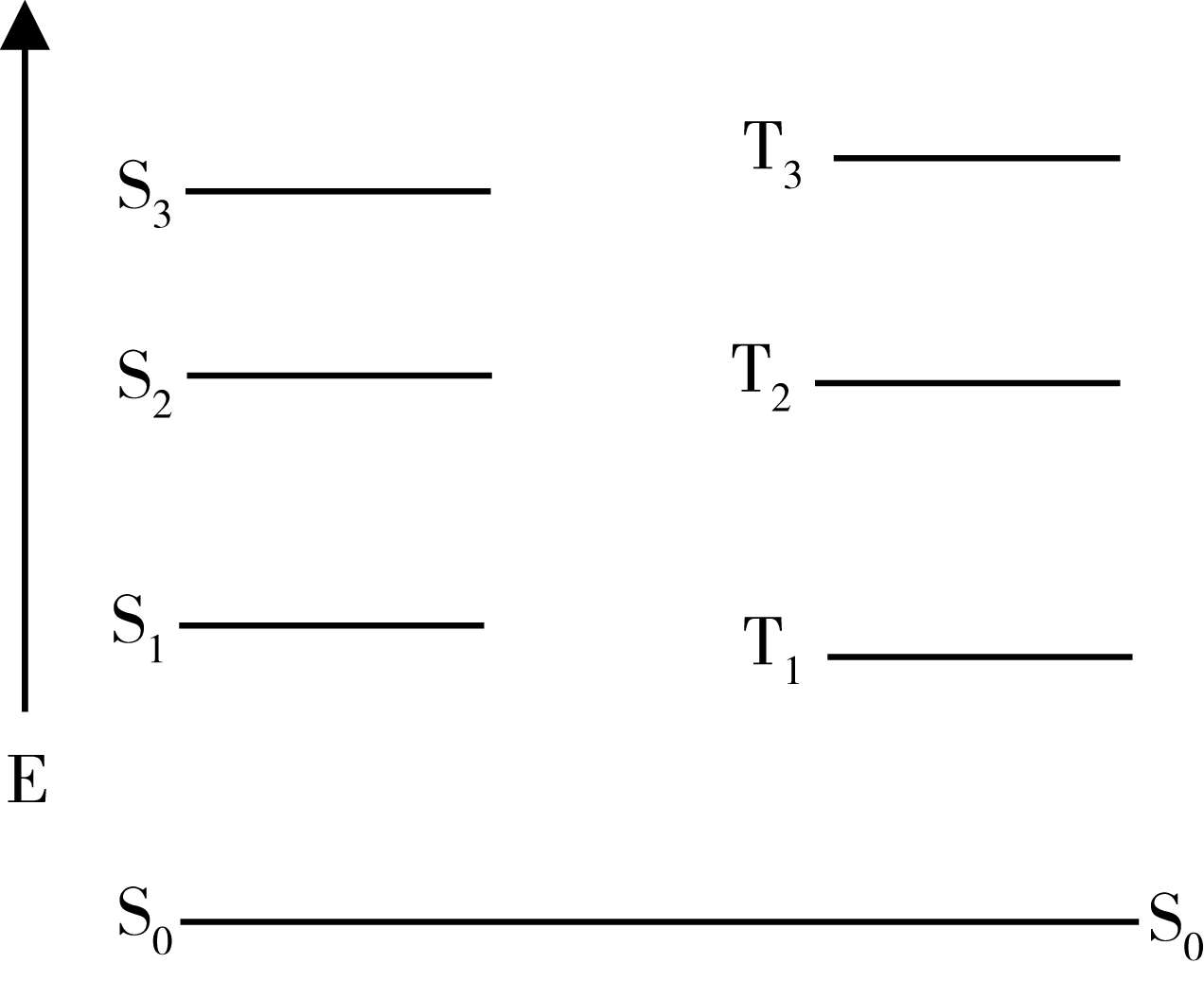 如果被激发至空轨道的电子的自旋与原先在基态轨道的方向相同,则激发态的S=0,M=1,此种电子激发态仍属S态,按其能量的高低可以以S 1 ,S 2 ,…表示之。如果受激电子的自旋方向与原在基态的相反,产生了在两个轨道中的自旋方向平行的两个电子,则S=1,M=3,此种态被称作三线态(triplet state)。因为在磁场中,分子中电子的总自旋角动量在磁场方向可以有三个不同值的分量,因此,三线态是三度简并的态,以T表示,按能量高低可有T 1 ,T 2 ,…激发T态。