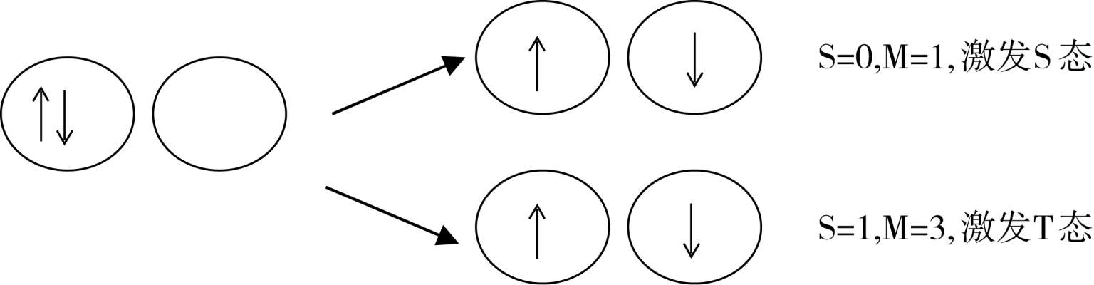 在考虑电子跃迁时,我们只考虑激发时涉及的那一对电子,假设其他电子状态在激发时不变,这样就将出现两种可能的情况: