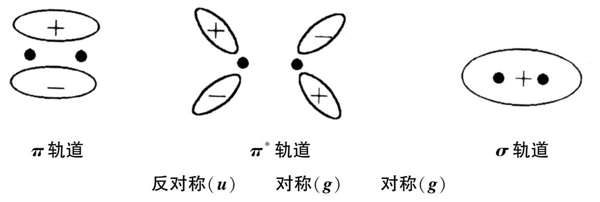 宇称禁阻由跃迁所涉及的轨道的对称性决定,分子轨道的对称性取决于描述分子轨道的波函数在通过一个对称中心反演时符号是否改变。波函数分为对称的( g )和反对称的( u )两类。通过对称中心反演,分子轨道的波函数改变符号,称为反对称的;如果不改变符号,称为对称的。选择定则指出 u → g 和 g → u 的跃迁是允许的,而 g → g 和 u → u 的跃迁是禁阻的。例如,乙烯的分子中, π 轨道是反对称的, π * 是对称的, σ 轨道是对称的,因此,乙烯的 π → π * ( u → g )跃迁是允许的,而 σ → π * ( g → g )跃迁是禁阻的,如图1-7所示。