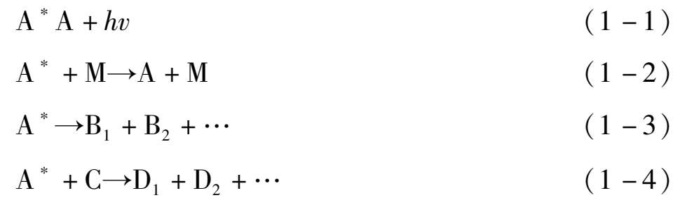 式(1-1)为辐射跃迁,即激发态物种通过辐射荧光或磷光而失活。式(1-2)为无辐射跃迁,亦即碰撞失活。激发态物种通过与其他分子M碰撞,将能量传递给M,本身又回到基态。以上两种过程均为光物理过程。式(1-3)为光离解,即激发态物种离解成为两个或两个以上新的物种。式(1-4)为A * 与其他分子反应生成新的物种。这两种过程均为光化学过程。