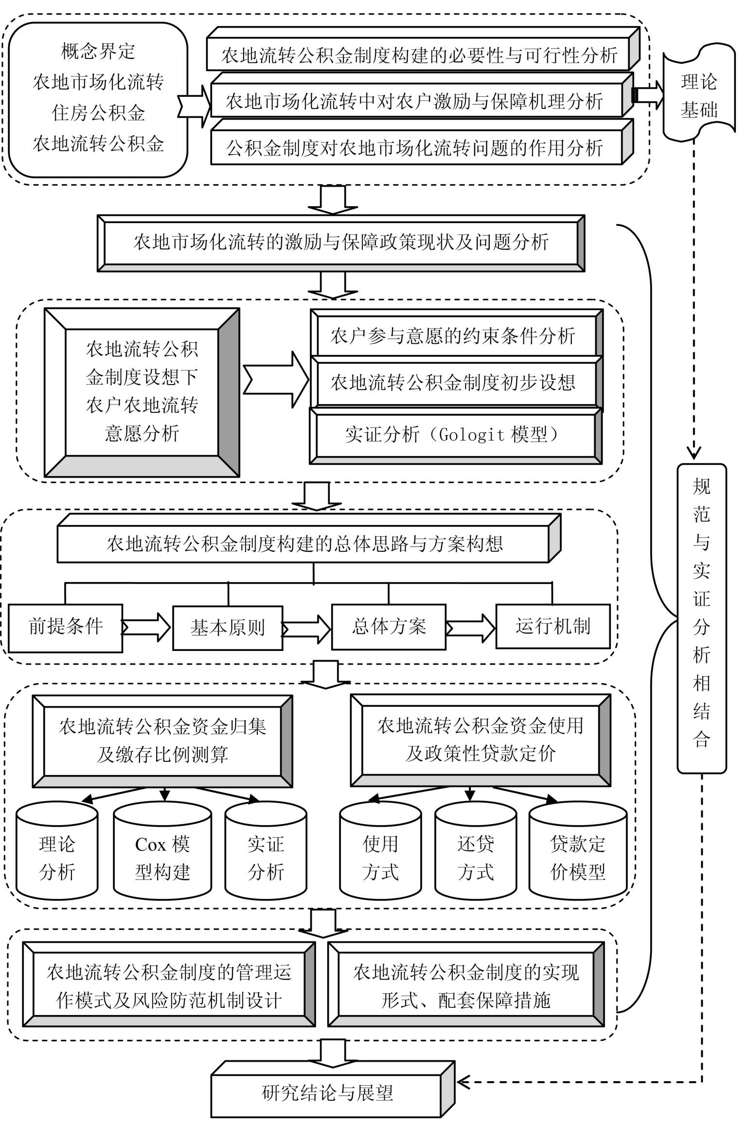 本书的基本思路是:以公共产品、社会保障、政策性金融等理论为支撑,在充分界定农地市场化流转、农地流转公积金等概念的基础上,提出以农地流转公积金制度构建理论分析框架,然后从宏观、微观层面分析农地市场化流转的激励与保障政策现状及问题,基于农户农地流转意愿视角探讨农地流转公积金制度设想的可行性,结合理论与实证分析结果提出农地流转公积金制度构建的总体思路与方案构想,再围绕农地流转公积金制度构建的三个核心部分内容,即资金归集、资金使用及管理运作模式,展开筹资主体能力分析、贷款定价模型构建与管理运作模式选择等具体设计研究,针对该制度运行中可能面临的风险进行了防范机制设计,再从农地产权制度变迁视角分析农地流转公积金制度的实现形式,并提出建立农地流转公积金制度的配套保障措施。