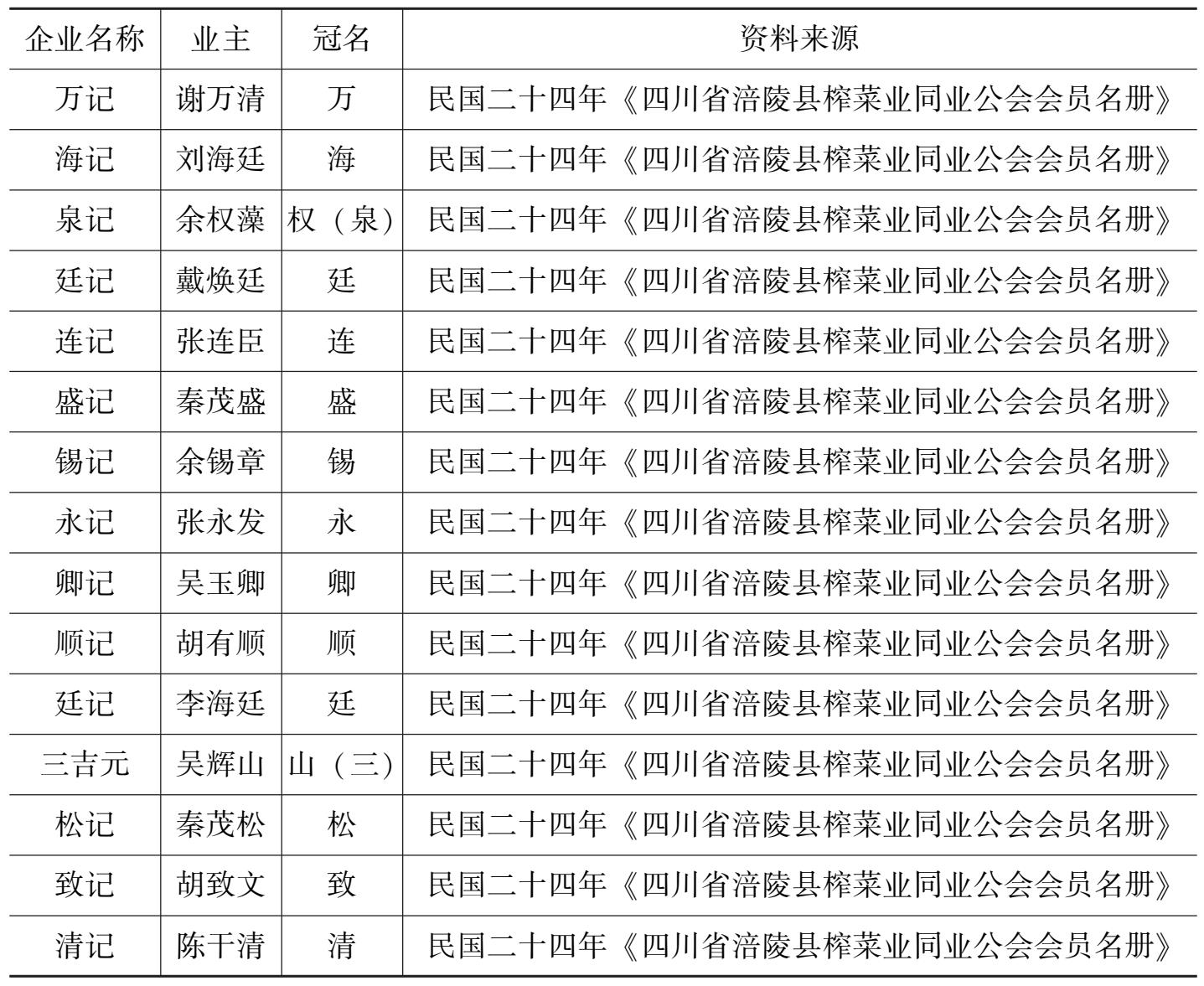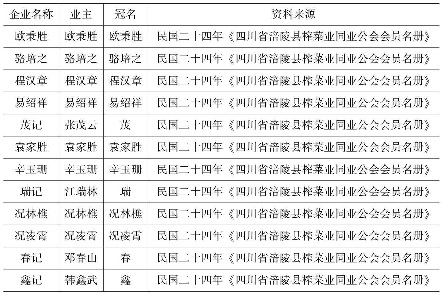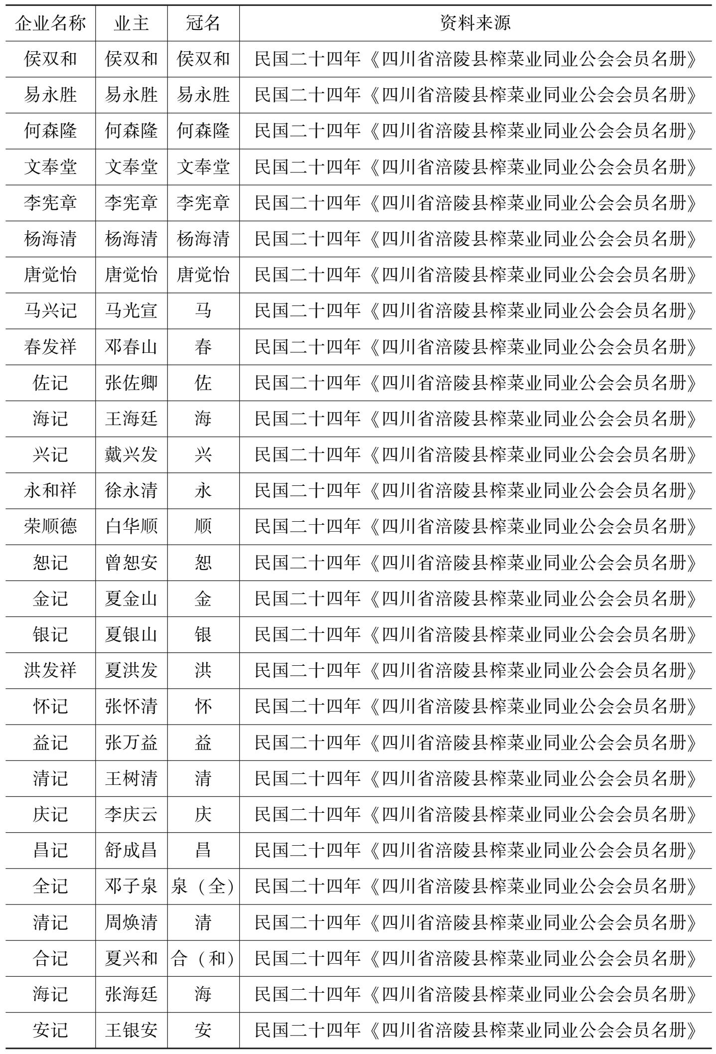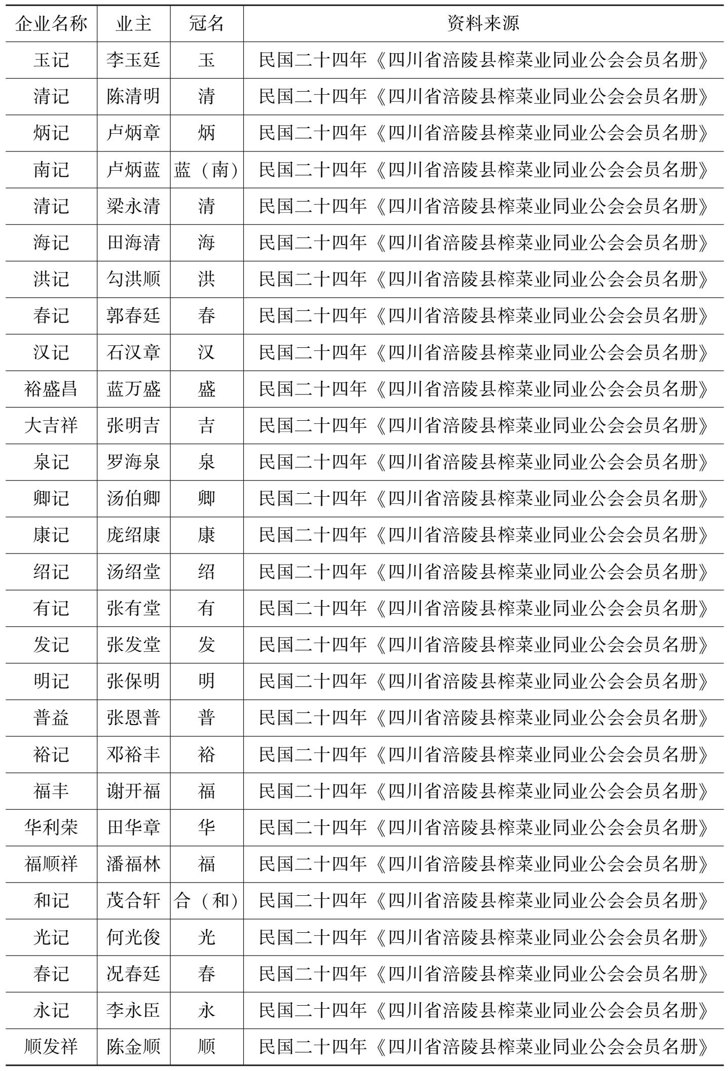 (三)家族式冠名。冠名是指在某种名称中融入姓氏、家族、人物的姓名字号。涪陵榨菜企业的冠名就是指在涪陵榨菜的企业名称中冠入企业老板或负责人的姓名字号,这不仅反映出中国近代社会受西方思潮影响而出现的个人主义倾向和独立人格意识,体现出中国人敢于担当的自立自强观念,也反映出中国传统文化的家族式情结,因为这种冠名可使人见名即知其家族与负责人。在涪陵榨菜企业中就存在不少以企业负责人名字冠名的情况。据民国三十四年(1935年)的统计就有80多家。见下表。