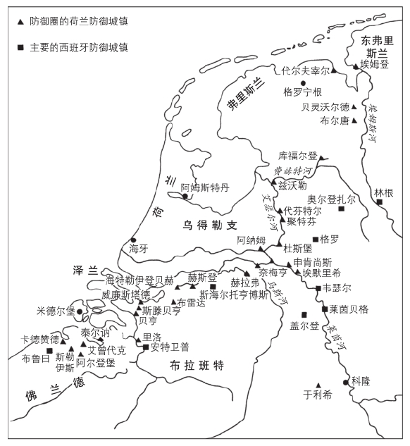 斯皮诺拉1605—1606年军事活动的主要目的是发动心理战,让共和国的整个东部边境显得不安全。为了巩固西班牙的胜利,大公夫妇和西班牙国王花了大笔资金来翻修占领的堡垒,为其配备人员。莱茵贝格在一名西班牙指挥官的管辖下,由超过2 000人的部队驻守。1608年,西班牙在奥尔登扎尔的卫戍部队有2 500人,他们控制着特文特。鉴于西班牙在格罗和林根的守军人数较多,东弗里斯兰伯爵又公开敌视共和国,总三级会议别无选择,只得开启一项规模和耗资都巨大的计划——沿共和国整个东部,以及南部边界,建造新防御工事,打造一个从埃姆斯河口的代尔夫宰尔一直延伸到斯海尔德河口的卡德赞德的宏大防卫圈。(参见地图9)