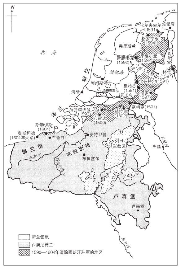 被拿下的许多城镇拥有强大的防御工事,这些工事和数量众多的堡垒证实了帕尔马公爵不懈的努力。从1585年重夺安特卫普以来,帕尔马公爵就竭力在新近重夺的地区构筑要塞网络。这既是为了守卫这些地区,也是为西班牙进一步进军充当跳板。建设这些要塞网络花费巨大。在1587—1588年腓力二世命令佛兰德军队与无敌舰队共同参与拟定好的入侵英格兰行动时,以及在16世纪90年代西班牙军队插手法兰西事务期间,这一防卫网络对西班牙、对低地国家的天主教事业更显重要,因为帕尔马公爵的堡垒和重新设防的城镇现在成了南北之间的主要壁垒。西属尼德兰的卡斯蒂利亚军队不仅要充当先锋部队,还要守卫最重要的驻地安特卫普、根特、登德尔蒙德(Dendermonde),守卫佛兰德海岸的敦刻尔克和尼乌波特,守卫位于斯海尔德河口、与荷兰飞地对峙的要塞城镇斯勒伊斯和萨斯范亨特(Sas van Ghent)。 4 那不勒斯军队守卫着布雷达。帕尔马公爵手下的西班牙高级军官不愿委托“瓦隆”步兵守卫直面荷兰的城镇,帕尔马公爵则并非那么不情愿。然而,无论是在布鲁塞尔还是在马德里,人们依然认为,在为西班牙保卫南尼德兰、守卫分割南北的前线方面,西班牙人和意大利人都至关重要。