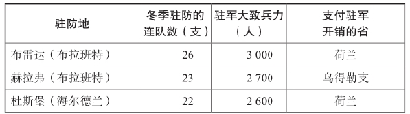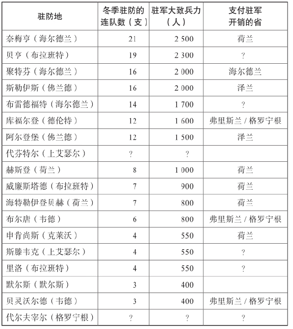 大多数卫戍军队靠着某省分摊的赋税维系,驻军城镇与给予他们财政支持的省份不可避免地发展出密切联系。于是,斯勒伊斯由泽兰负责卫戍,布雷达由荷兰负责卫戍,赫拉弗则被分给乌得勒支。莱茵河下游的驻军也主要受荷兰省财政支持。然而,东北部边境的情况稍有不同。弗里斯兰在这里具有潜在优势,而格罗宁根和上艾瑟尔对此极为反对,这让荷兰省得以采用混合的驻军,尤其是在布尔唐和贝灵沃尔德,这两地的驻军由弗里斯兰和格罗宁根共同负责。 67 对于那些坐落在7个投票省份领地上的要塞,如海尔德兰的阿纳姆、聚特芬和奈梅亨,荷兰省的赫斯登和海特勒伊登贝赫,任命这些要塞的指挥官是各个省份天然的权力。 68