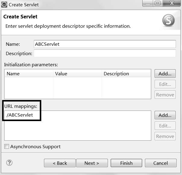使用Eclipse创建Servlet程序的过程中,URL Mappings描述了URL路径和Servlet物理文件之间的映射关系。例如前文创建的ABCServlet.java程序,其中的@WebServlet("/ABCServlet")是一个Java注解,其功能是将浏览器地址栏URL路径中的“/ABCServlet”映射为ABCServlet.java物理文件。在浏览器地址栏中输入URL路径http://localhost:8080/get/ABCServlet,浏览器就会向Tomcat服务器发送GET请求,Tomcat服务器接收到该请求,就会将该请求指向get项目的ABCServlet.java,并实例化ABCServlet类的对象,触发ABCServlet的doGet()方法执行。
