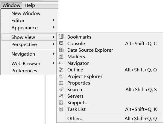 Eclipse的操作界面看起来复杂,但实际上Eclipse界面由一个个简单的视图(View)组成,所有的Eclipse操作都是在视图中进行的。掌握了Eclipse视图的使用就掌握了Eclipse的使用,初学者首先应该学会如何打开Eclipse视图。在Eclipse菜单栏中单击Window菜单→选择Show View→弹出视图子菜单,如图2-7所示,选择要打开的视图即可。本书常用的视图有项目浏览视图(Project Explorer)、服务器视图(Servers)和控制台视图(Console)等。