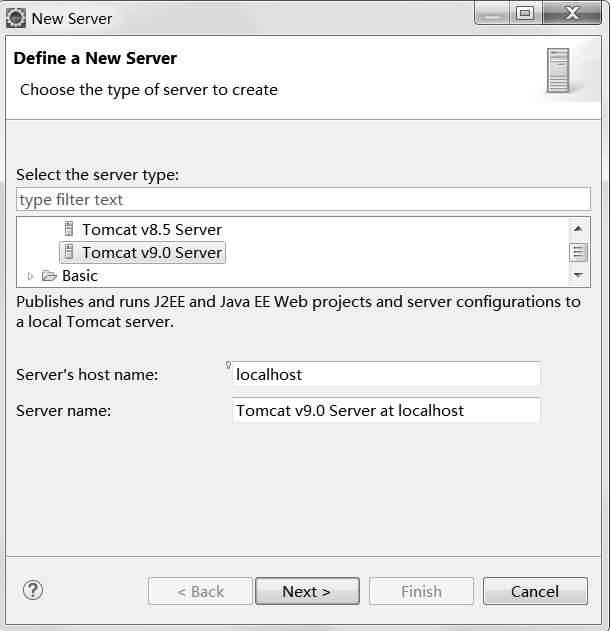 (1)在Eclipse菜单栏中单击Window菜单→选择Show View→单击Servers命令→进入Servers视图→单击No servers are available. Click this link to create a new server...链接→弹出New Server窗口→找到Apache文件夹→选择Tomcat v9.0 Server,如图2-11所示。