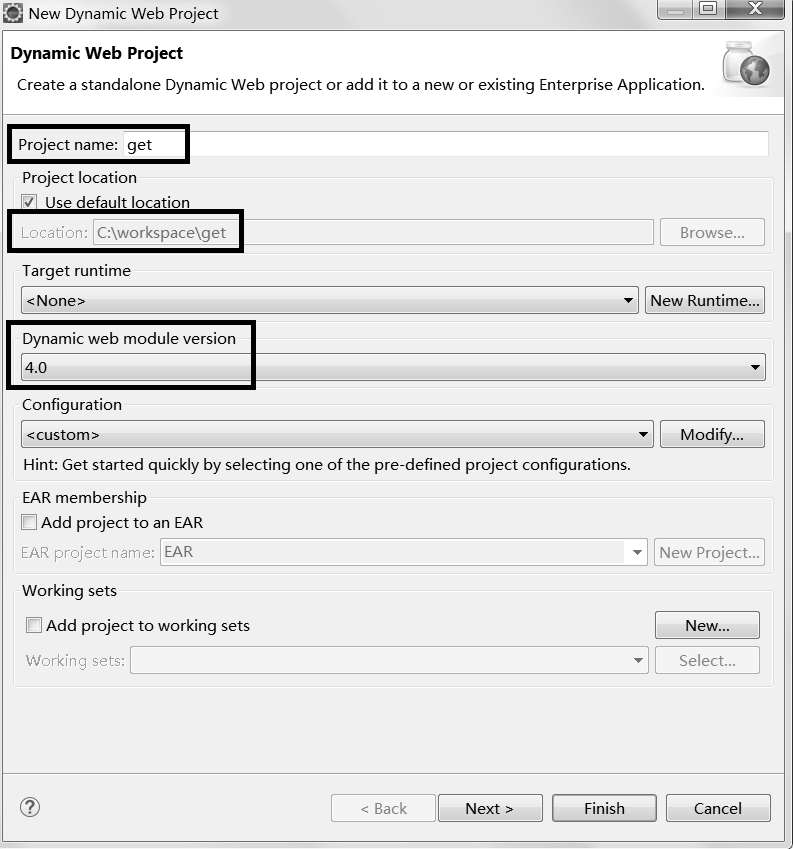 (2)在Project name文本框中输入项目名称(例如get),在Dynamic web module version中选择4.0,其他选项保持默认设置(请留意项目的保存位置)。
