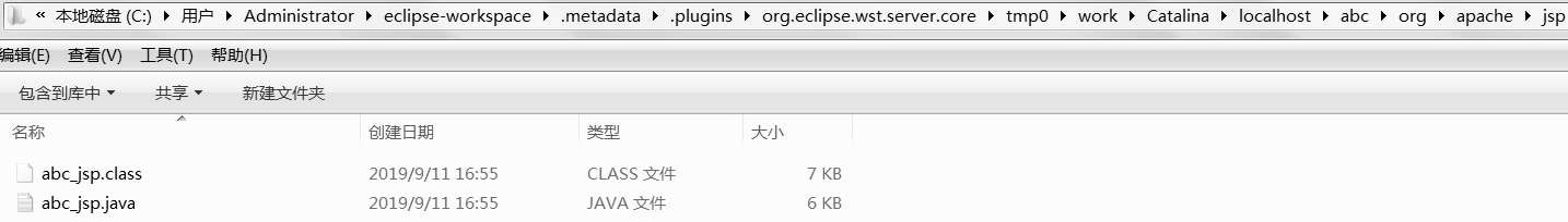 例如,首次运行abc.jsp,Eclipse中的Tomcat会在图2-21所示的目录中生成abc.jsp对应的abc_jsp.java文件(实际上是Servlet程序),并将其编译成字节码文件abc_jsp.class。